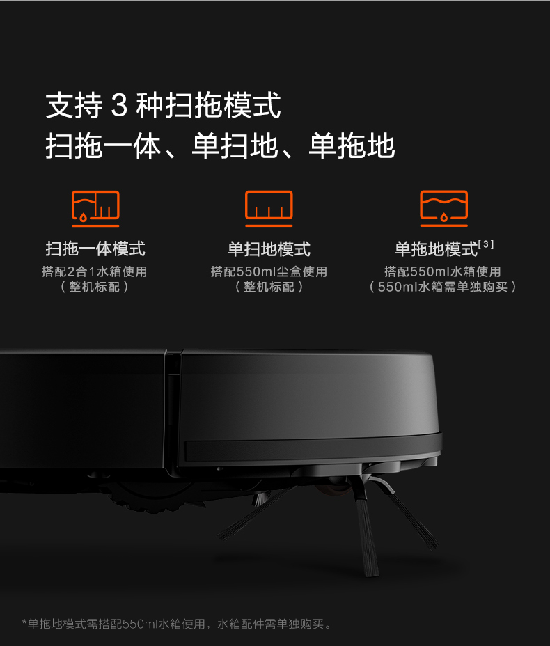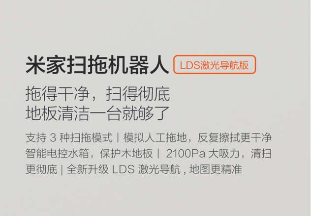米家新推出的扫拖一体机,升级为LDS激光导航,配备12组传感器,全局精准规划,拥有2100Pa大吸力,专业拖地路径设计,支持三档水量调节,智能电控水箱,拥有扫拖一体模式、单扫地模式和单拖地模式。