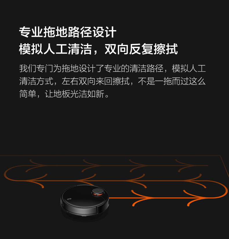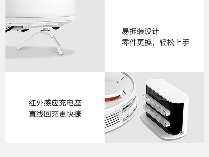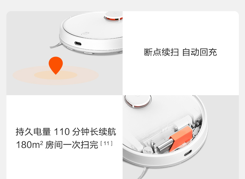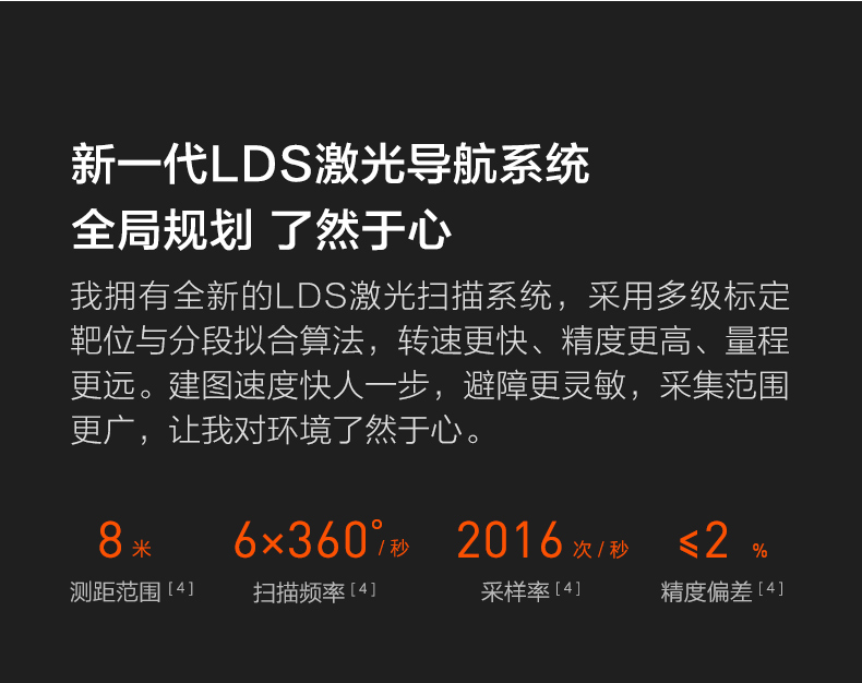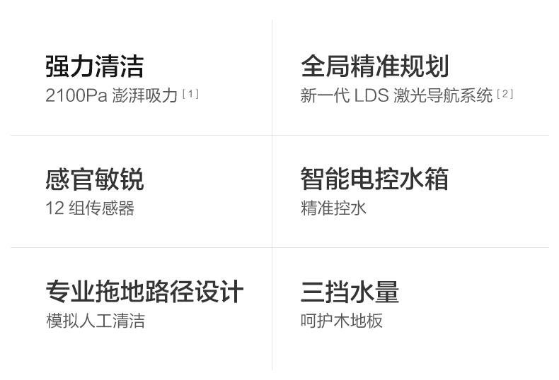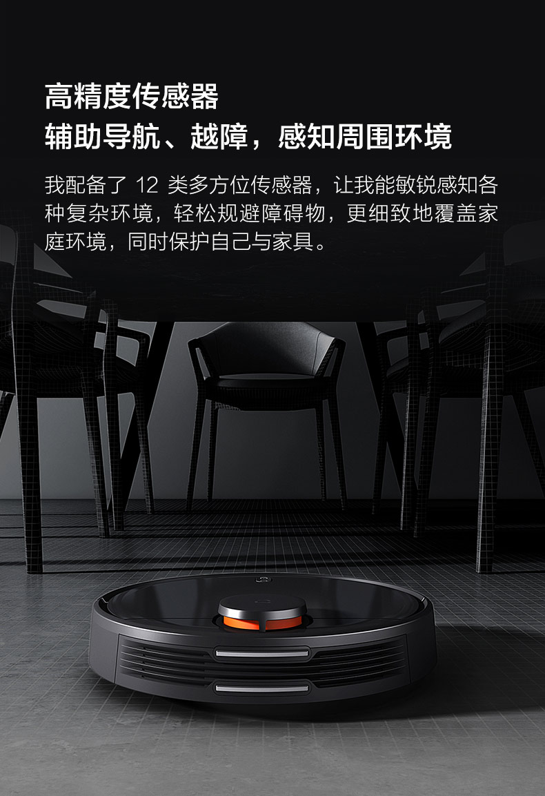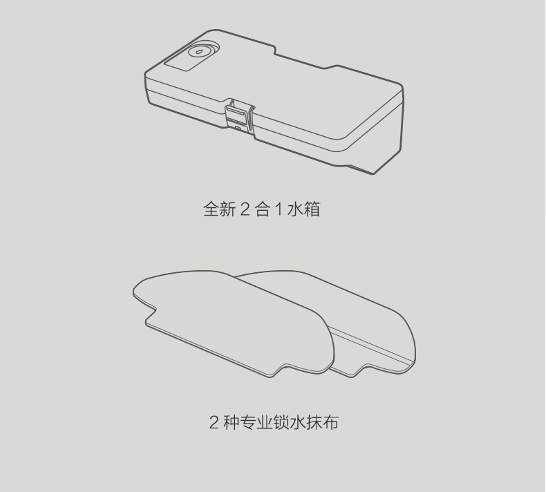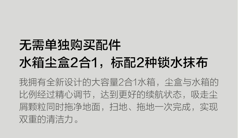 水箱尘盒二合一设计,标配2种锁水抹布。 全新的LDS激光导航测距范围可达8米,采用四核Cortex-A7芯片,mali400图像处理器,支持米家APP远程操控,分区清扫,房间合并与分割,可指定房间清扫。支持动态路径规划,扫地、拖地路径不一样。拥有110分钟长续航能力,一次性可清扫180㎡。