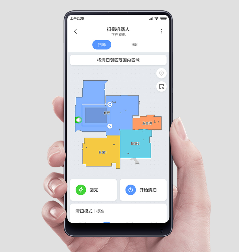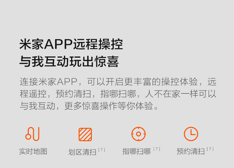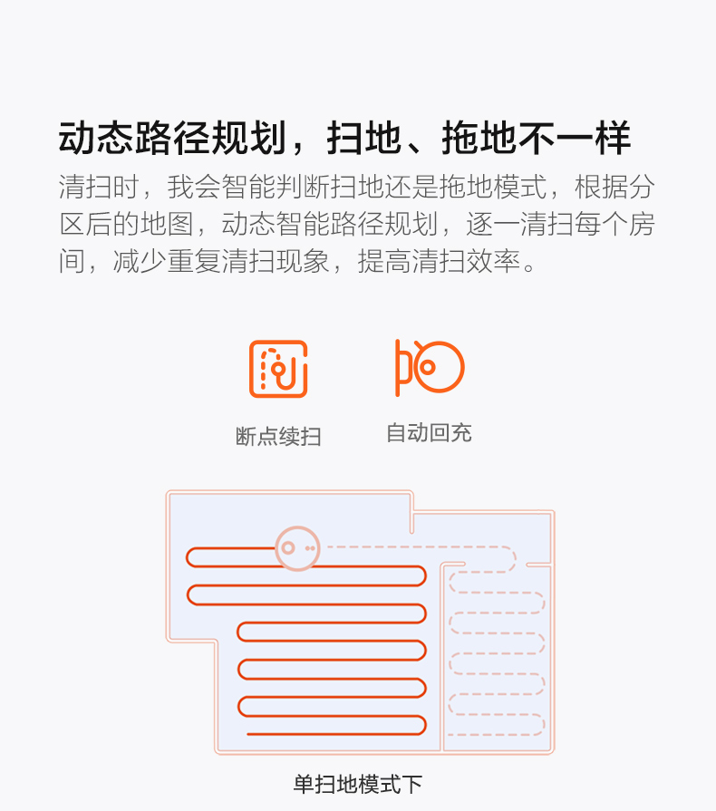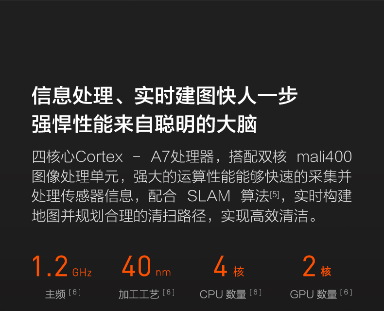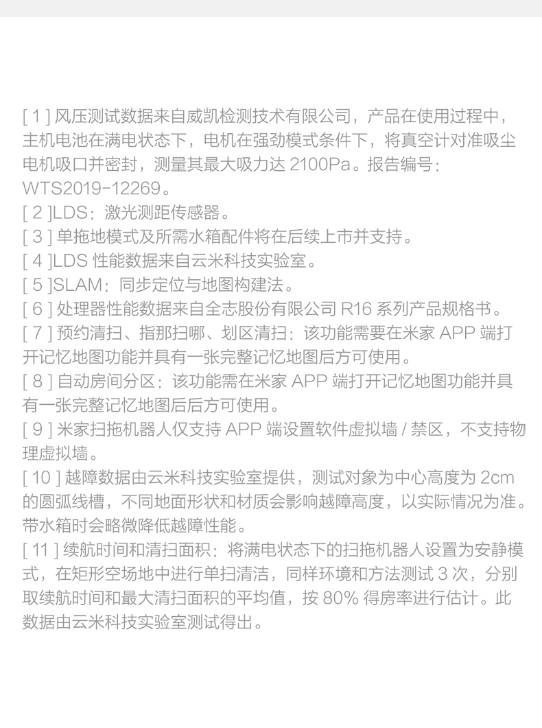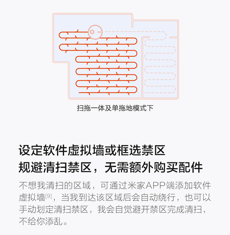 水箱尘盒二合一设计,标配2种锁水抹布。 全新的LDS激光导航测距范围可达8米,采用四核Cortex-A7芯片,mali400图像处理器,支持米家APP远程操控,分区清扫,房间合并与分割,可指定房间清扫。支持动态路径规划,扫地、拖地路径不一样。拥有110分钟长续航能力,一次性可清扫180㎡。