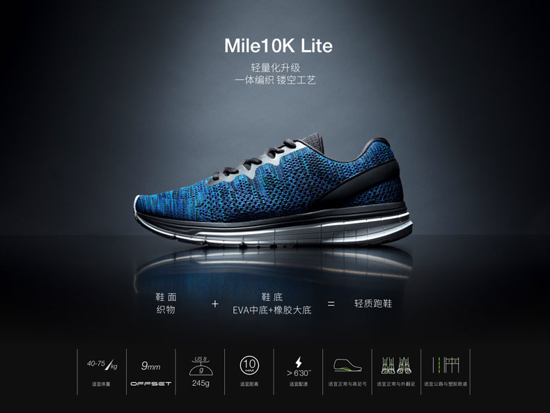 必迈Mile 10k lite,是定位1/4马拉松距离的10公里跑步鞋,适合大多数人跑步健身的用户,或者当压马路的鞋子穿。鞋面使用流行的一体针织设计,有像袜子一样的舒适包裹感。