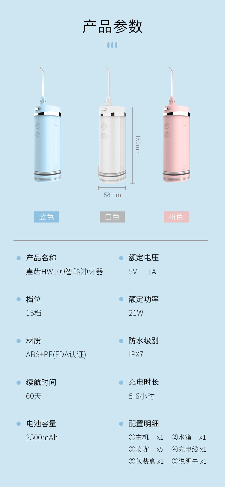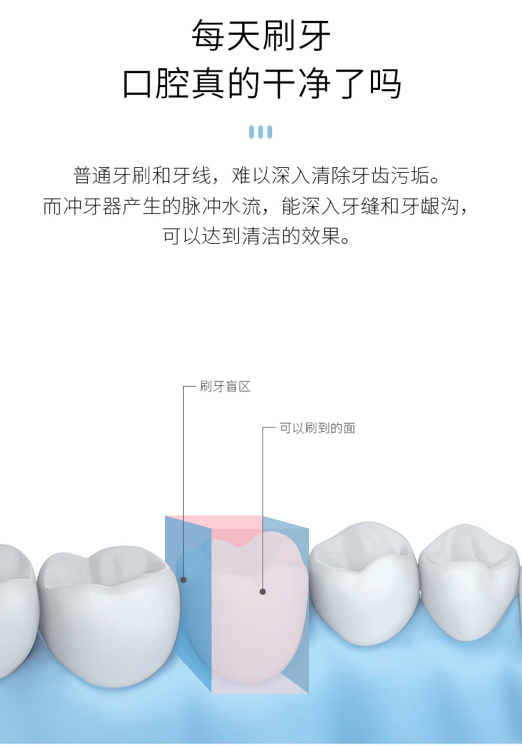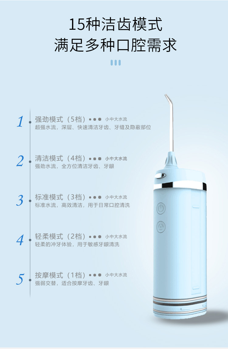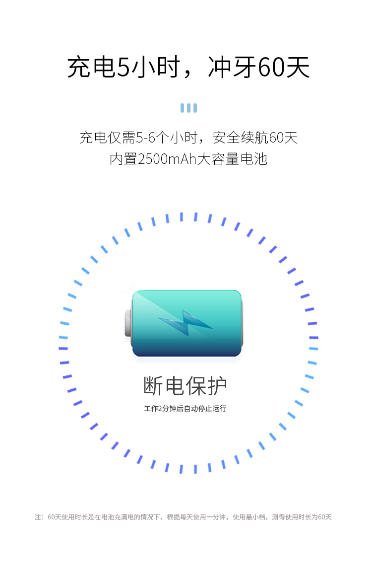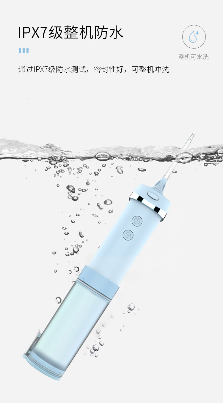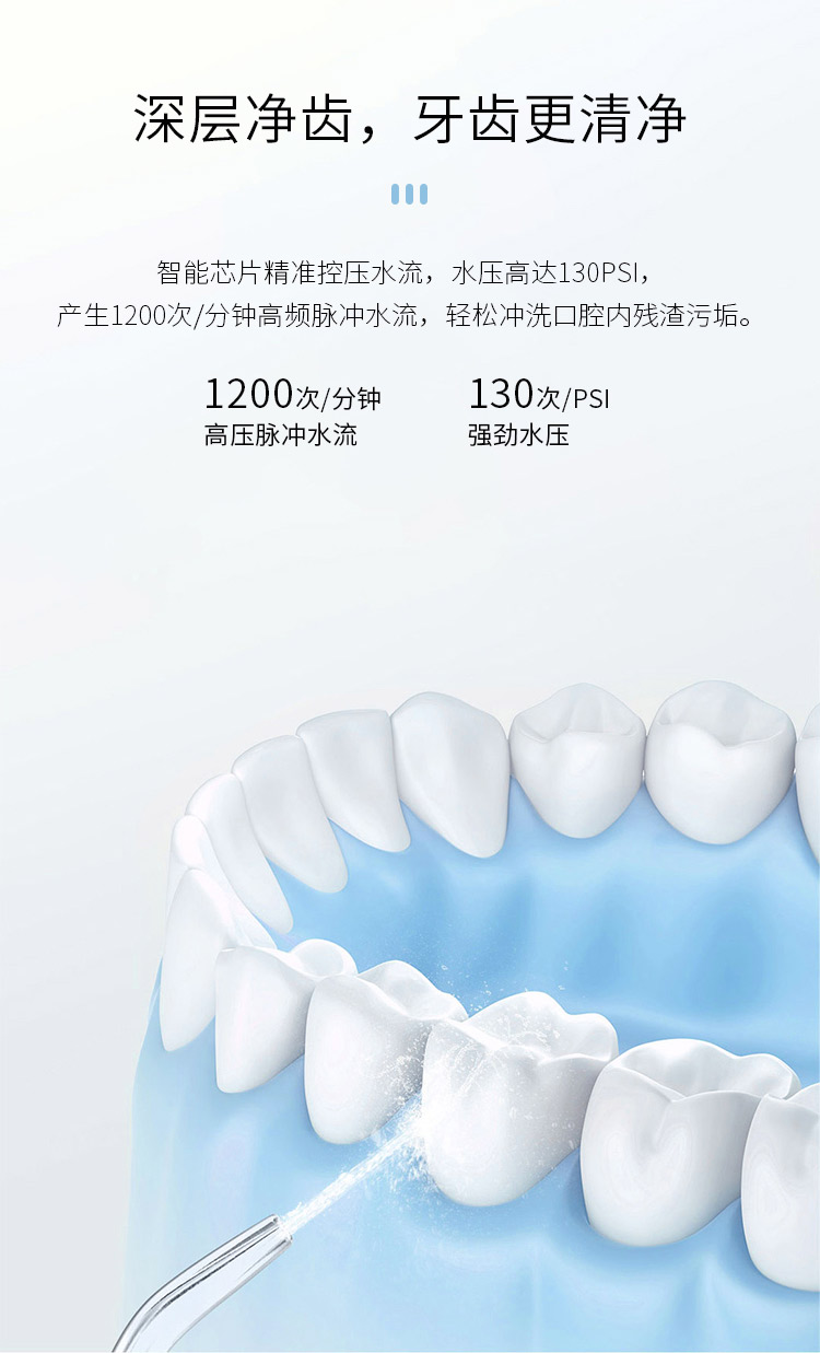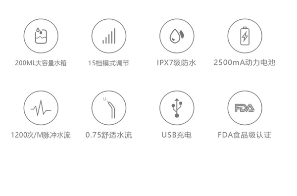 智能芯片精准控压水流,水压高达130PSI,产生1200次/分钟高频脉冲水流,轻松冲洗口腔内残渣污垢。15档位任意挑选,2500毫安超大锂电池,充电一次可以使用60天,IPX7级防水,洗澡淋浴皆可使用,FDA食品级认证。