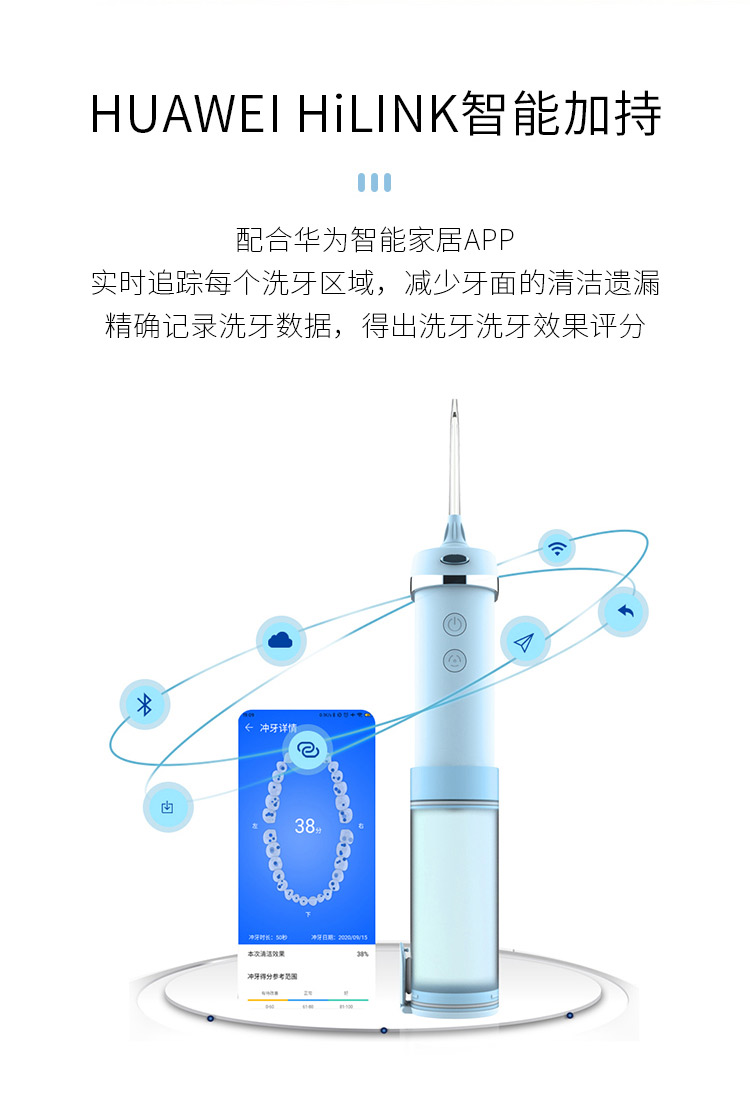 支持华为智能APP连接,实时追踪每个洗牙区域,减少牙面的清洁遗漏,精确记录洗牙数据,得出洗牙洗牙效果评分。