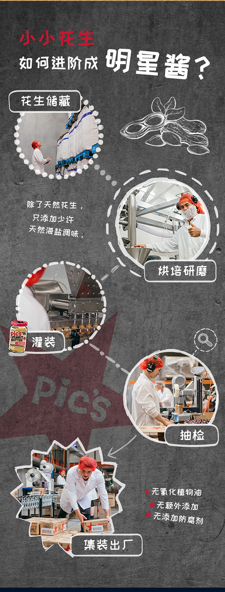 制作工艺上, Pics花生酱经过烤制后的花生会在15分钟之内研磨装瓶,这样使得花生酱的原味和健康被最大程度的保留下来。非转基因搭配零添加,营养又健康,成品为硬韧的泥状,花生香味浓郁。