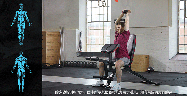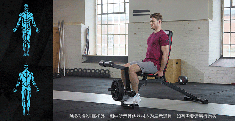 这款阿迪达斯ADBE-10238家用健身椅,是一款多功能卧推凳,配备有可调节二头肌板垫、铃片杠铃负重架、靠垫调节架、坐垫调节架,可以配合完成肱二头肌训练、背部肌群、三角肌训练、斜方肌训练、胸肌训练、腹肌训练、大腿肌群训练。