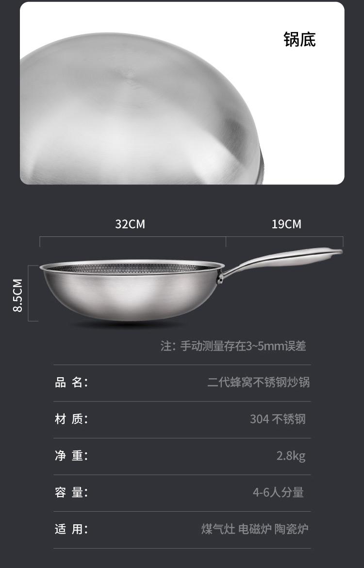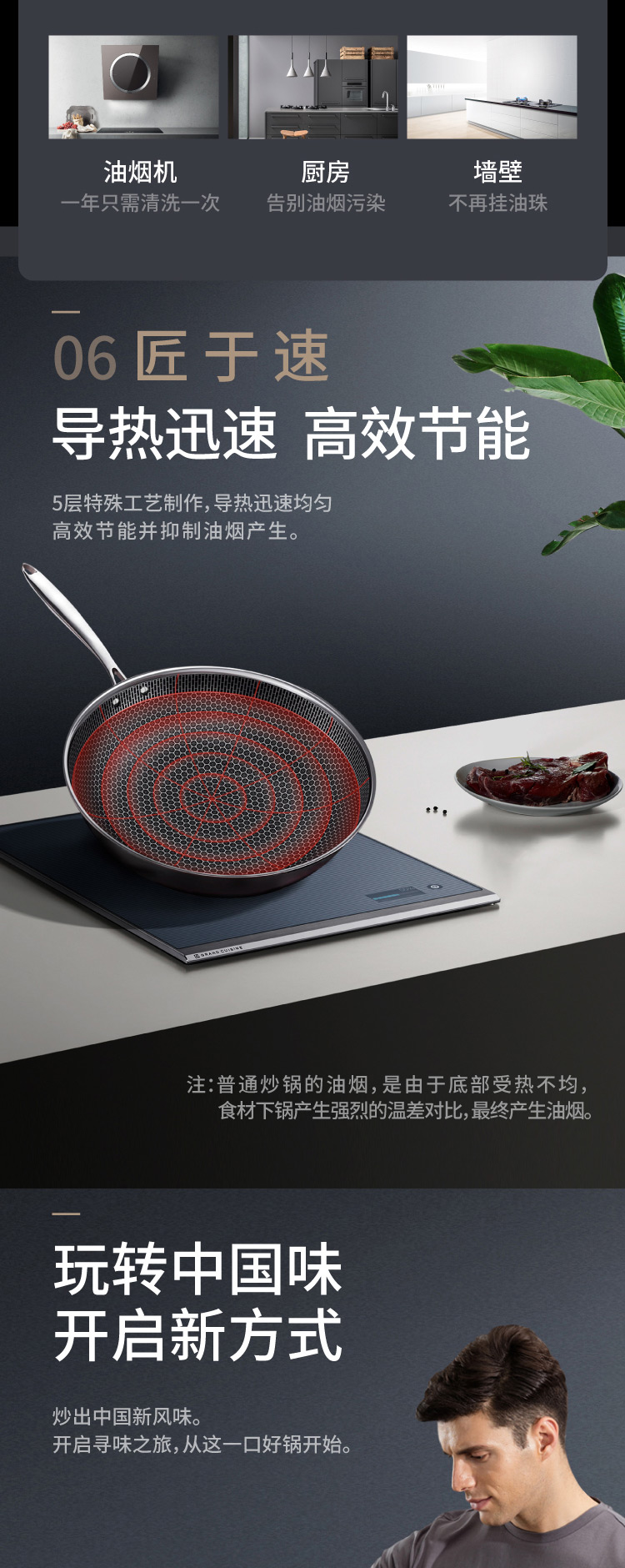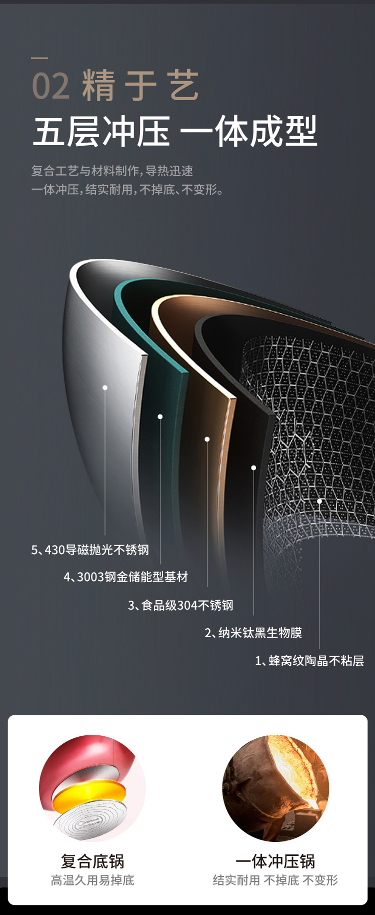 五层冲压一体成型的锅底,升温迅速且均匀,不挑炉灶,燃气灶、电磁炉等都适用。8.5cm锅深设计,平时做饭的煎炒蒸煮都能实现。把手与锅身为加固铆钉,内里的固定处光滑设计,不易藏污纳垢,冲洗迅速,也保证坚固耐用。