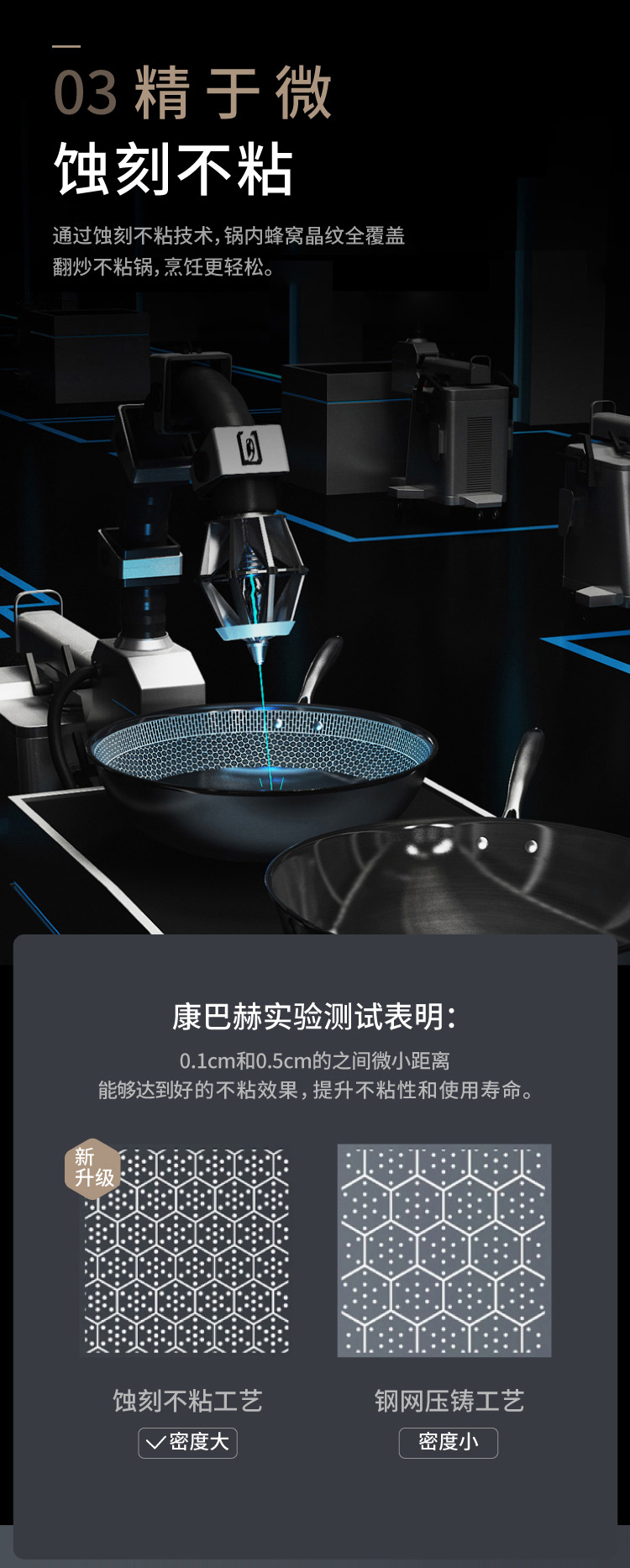 这款康巴赫不粘锅,采用了比C级老款半屏更高的E级全面不粘技术,实现锅内的全方位防粘。锅身是包括食品级304不锈钢在内的,共五层冲压,一体成型设计,更为牢固耐用。其中,锅内的蚀刻不粘工艺实现了蜂窝纹理全面覆盖,大幅度提高不粘特性,且少油烟,锅底不易发黄、不怕剐蹭,一擦即净,方便清理。