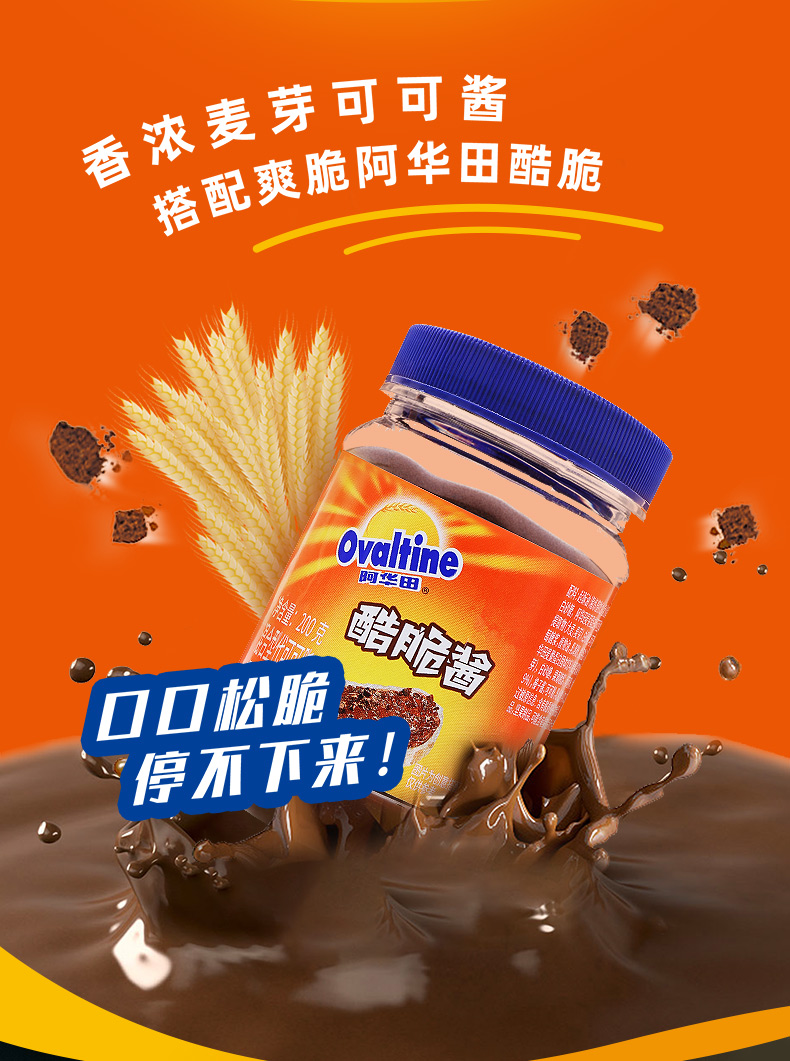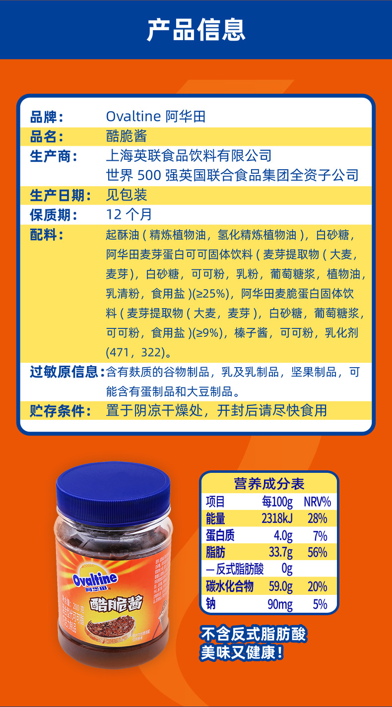 瑞士百年品牌,阿华田酷脆酱巧克力酱,畅销全球50多个国家,原料均为进口,新西兰奶源,印度尼西亚的可可豆,阳光大麦,层层把关,只为产品的好口感和味道,可以抹面包、烘焙等,产品不含反式脂肪酸,食用也比较健康。