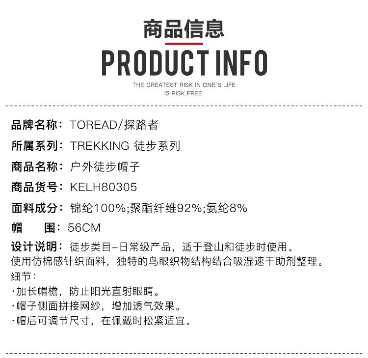 加长帽檐,防止阳光直射眼睛;帽子两侧还有网纱拼接,增加了透气效果;帽宽57cm,后尾带能调节帽周,适用于登山、徒步、日常休闲。