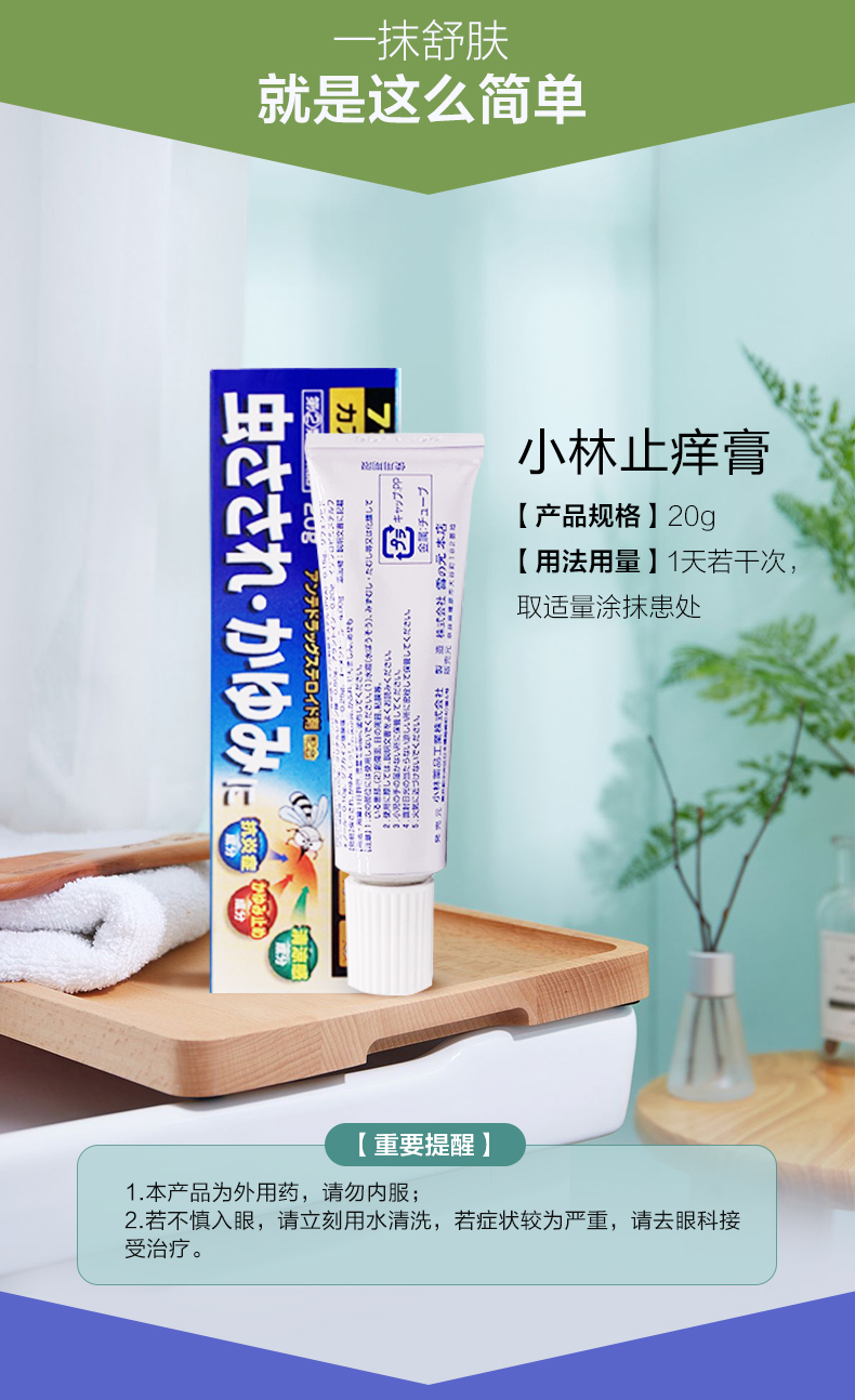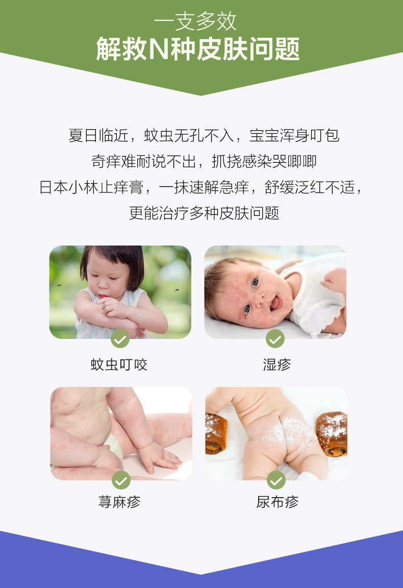 日本小林婴儿止痒膏,医用级配方,甄选高纯度薄荷萃取物“L-薄荷醇”,城搭配专研解痒成分,防止蚊虫叮咬,一抹清凉,冰感劲爽,60秒速解急痒,更有效解决湿疹,荨麻疹,尿布疹,迅速解决宝贝刺痒哭闹,轻松涂抹,清爽不腻,妈妈的选择!