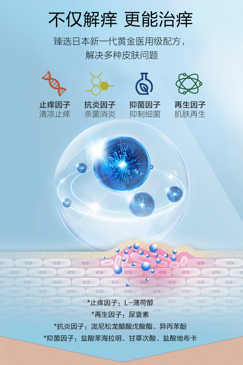 止痒因子: L-薄荷醇再生因子:尿囊素抗炎因子:泼尼松龙醋酸戊酸酯、异丙苯酚抑菌因子:盐酸苯海拉明、甘草次酸、盐酸地布卡