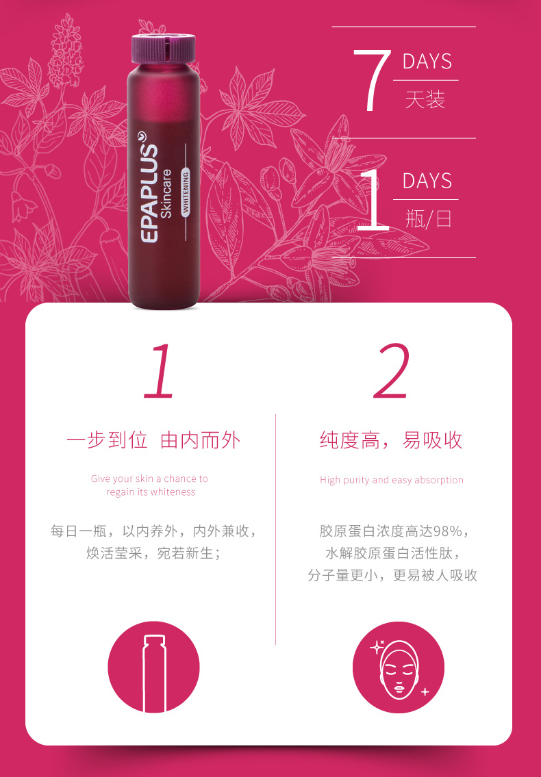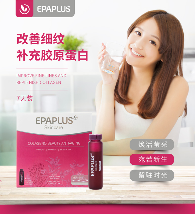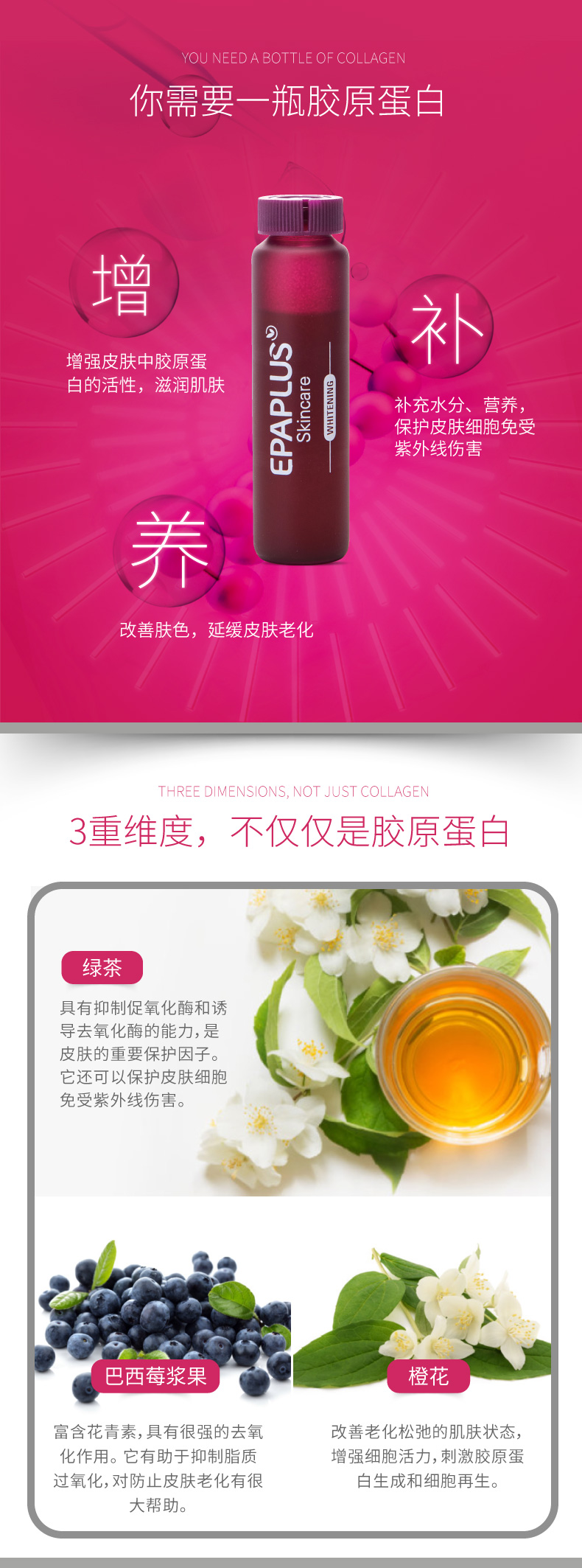 这款EPAPLUS 胶原蛋白原液态饮 ,规格:25ml*7支,胶原蛋白浓度高达98%,水解胶原蛋白活性肽,分子量更小,更易被人吸收。增强皮肤中胶原蛋白的活性,滋润肌肤;补充水分、营养,保护皮肤细胞免受紫外线伤害;改善肤色,延缓皮肤老化。绿茶提取物具有抑制促氧化酶和诱导去氧化酶的能力,是皮肤的重要保护因子,它还可以保护皮肤细胞免受紫外线伤害;巴西莓浆果提取物富含花青素,具有很强的去氧化作用,有助于抑制脂质过氧化,对防止皮肤老化有很大帮助;橙花提取物可以改善老化松弛的肌肤状态,增强细胞活力,刺激胶原蛋白生成和细胞再生。每日—瓶,以内养外,内外兼收,焕活莹采。