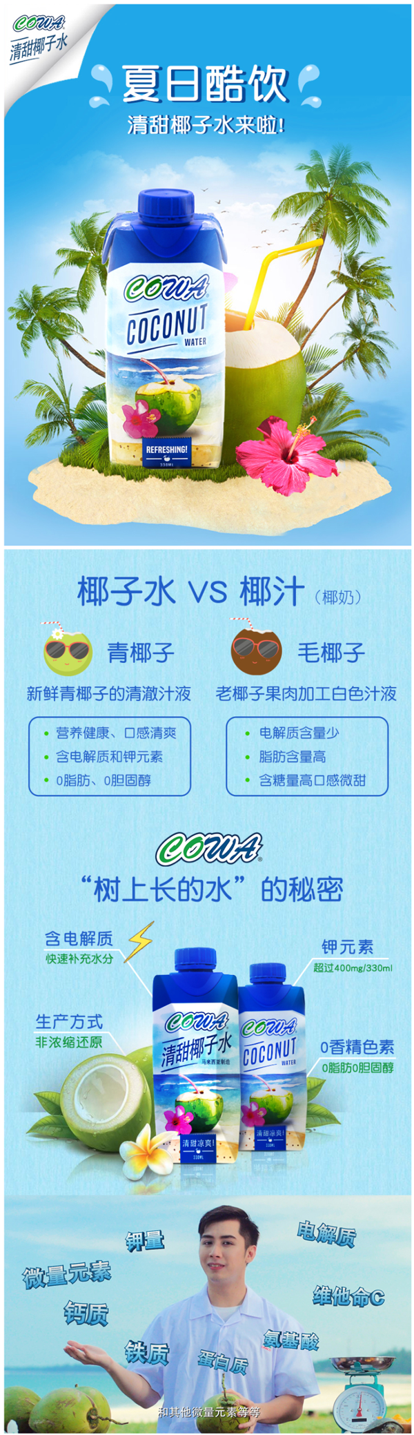 这款COWA椰子汁饮料,马来西亚原装进口,严格筛选优质椰子新鲜榨汁而成,不添加香精、色素、防腐剂等,色泽清澈,入口柔滑,椰香浓郁,微甜不腻,口感醇厚。低能量、0脂肪,0胆固醇,经常饮用对身体无害,经过巴氏瞬间消毒罐装。