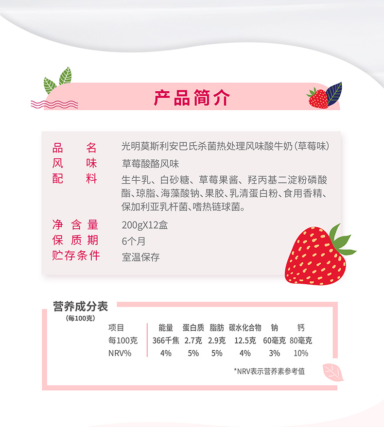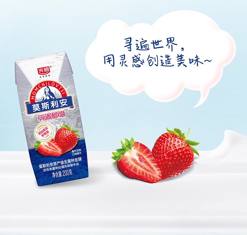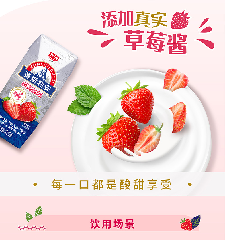 选用来自保加利亚长寿村莫斯利安的醇正生牛乳纯天然发酵,进口巴氏杀菌处理,带来更安全的奶源保障,口感香浓丝滑,清新草莓味。