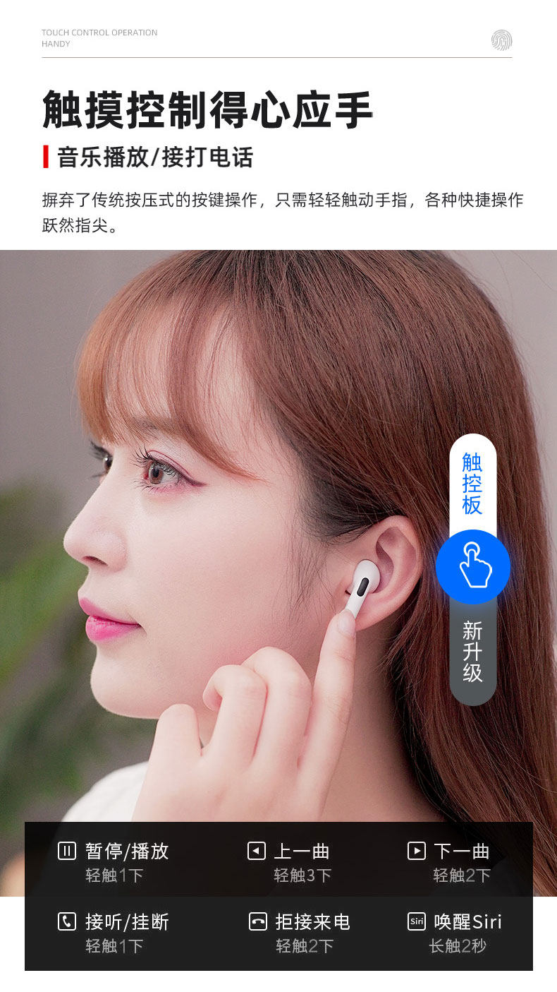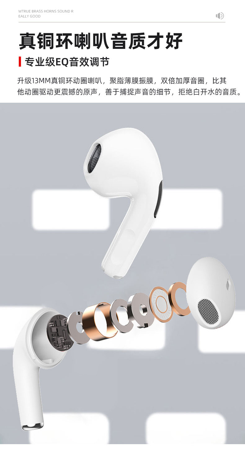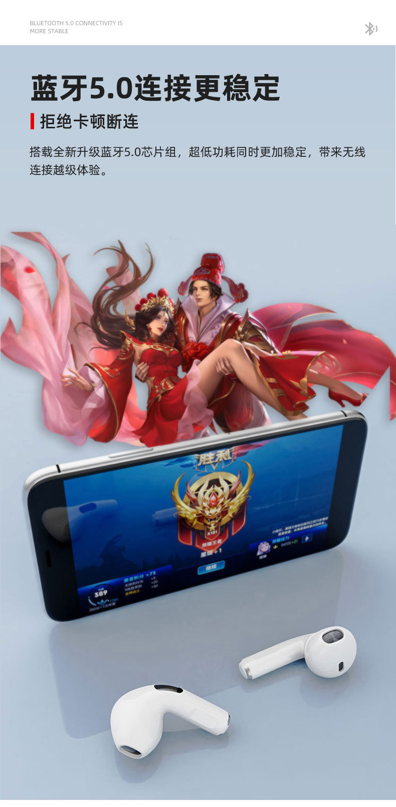 内置蓝牙5.0高速芯片,连接迅速能耗低,支持指纹触控操作,触摸即可实现多种操控,高品质13mm旗舰单元,音质优秀,续航长达4小时,搭配充电仓使用,玩一整天也够用。