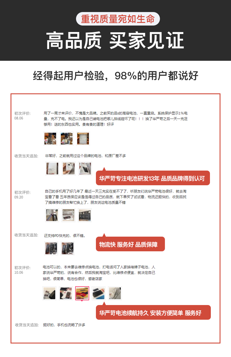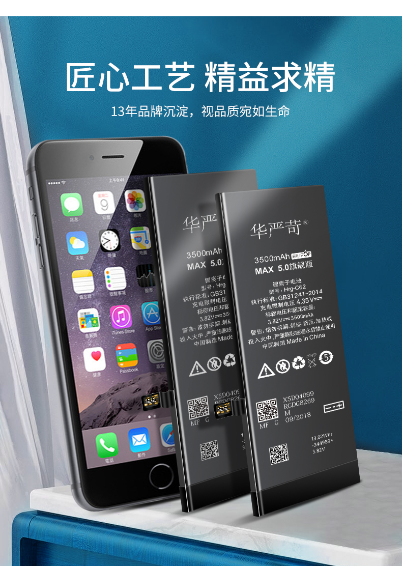再就是觉得飞毛腿的做工只能说一般,表面不是很平整。后来咨询做手机维修朋友,他说一般在手机维修的地方,都用最便宜的电池,都不如飞毛腿,而他换过比较好的苹果电池,是华严苛的,这牌子知名度不如飞毛腿和品胜,但手机电池业内都很认可这牌子。尺寸和苹果原厂一致,做工平整,焊点牢固,屏蔽措施,要是买回来对比一看便知。