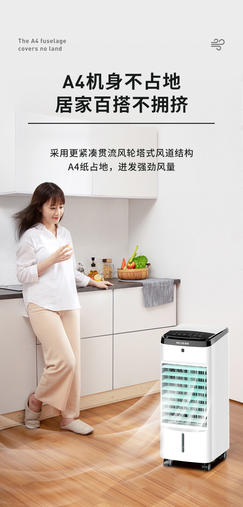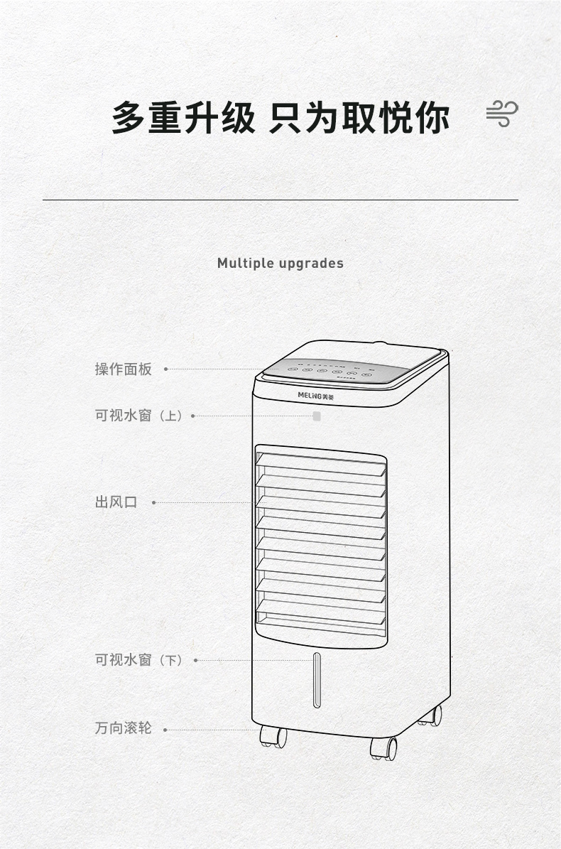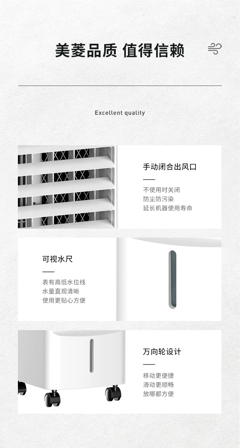 美菱 空调扇使用涡轮贯穿技术,三档风速可调,适合小居室使用,清凉度适中,优质植物纤维水帘,可阻碍过滤空气中的毛发、尘埃等异物,让出风更干净,3L大容量可视水箱设计,一次加水长久使用。显示面板功能齐全,简单易懂方便操作。