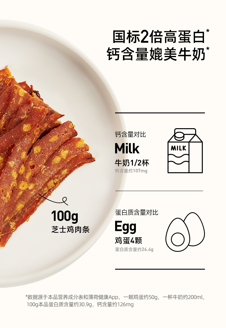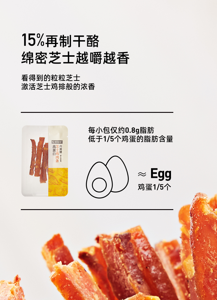 这款薄荷健康 高蛋白芝士鸡肉条,精选优质鸡肉,好肉才有好口感。鲜全蛋液浸裹,增香柔嫩不干柴。8h慢火炭烧,果木香渗入肌理。绵香芝士交织耐嚼鸡肉,肉香MIX奶香,双重幸福感。