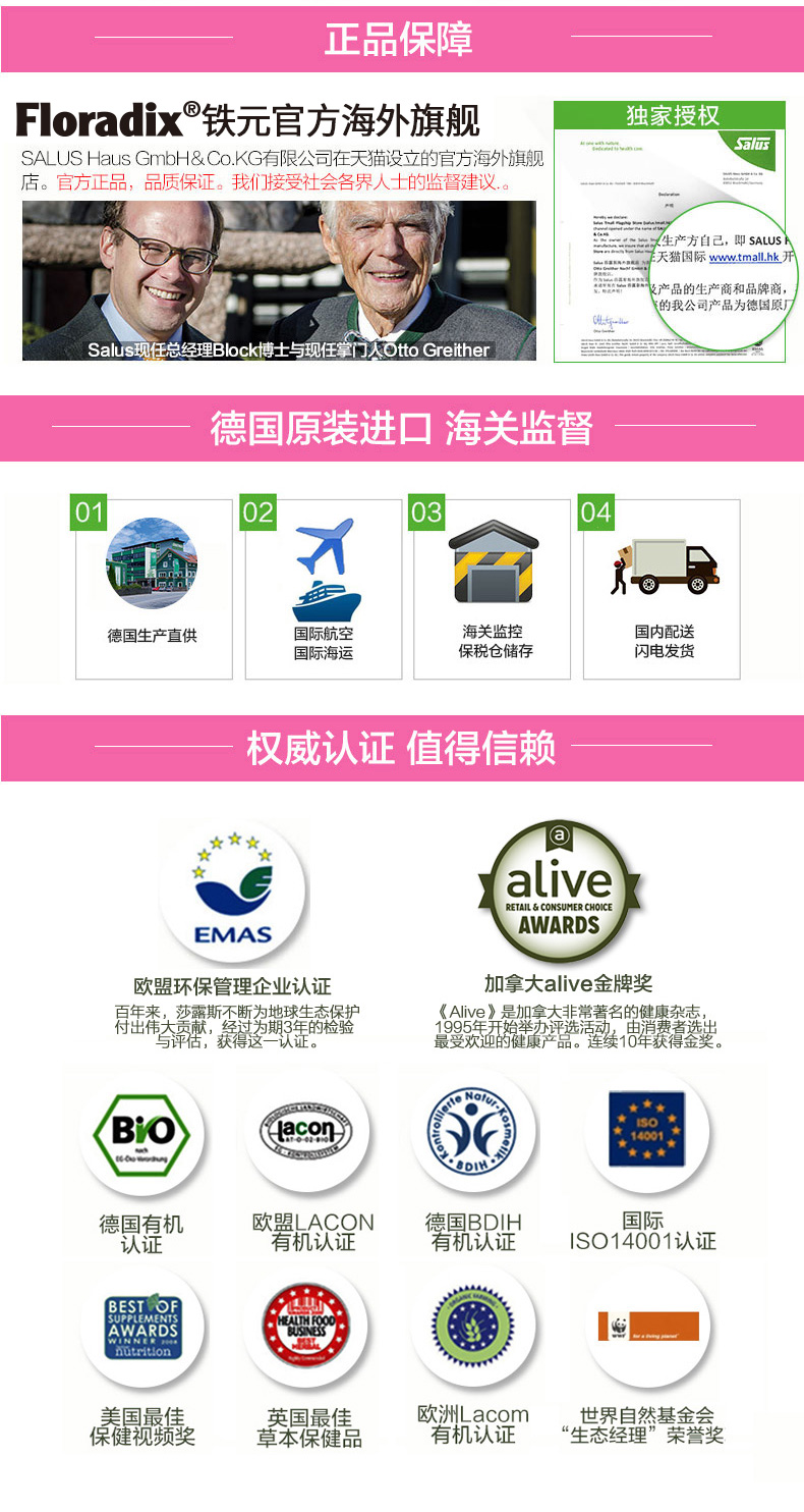 旗下产品通过德国有机认证、欧盟LACON有机认证、德国BDIH有机认证、国际ISO1401认证、美国最佳保健食品奖、英国草本保健品、欧洲Lacom有机认证、世界自然基金会“生态经理”荣誉奖。总结就是非常天然健康靠谱,可以放心买。