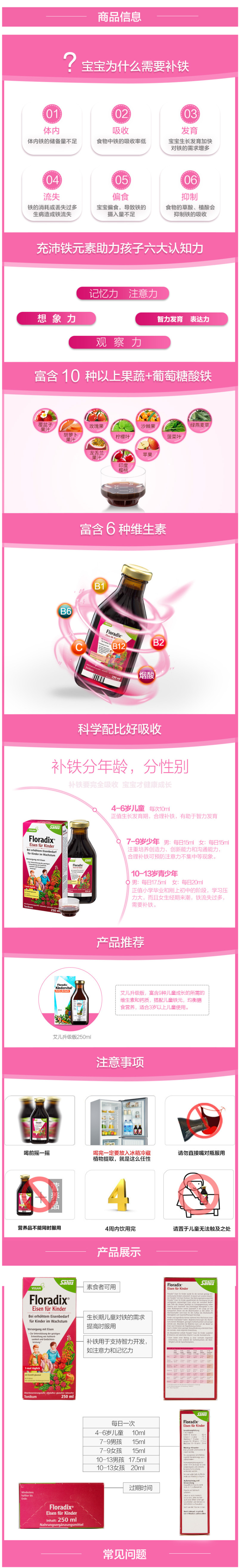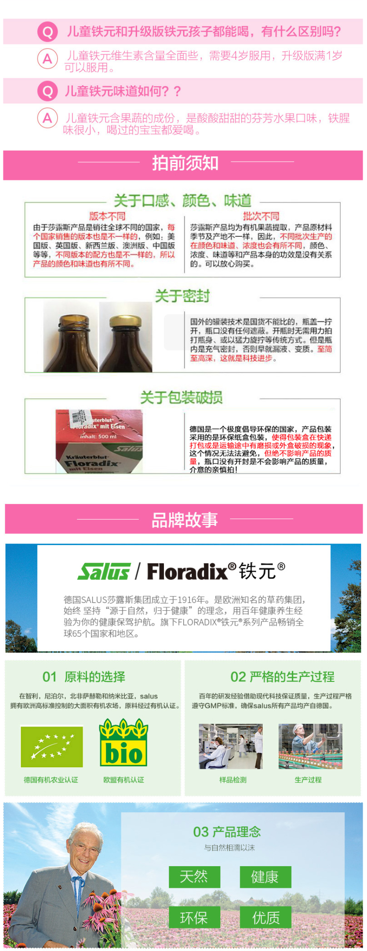 这款莎露斯Salus儿童铁元,德国原装进口,主要成分是葡萄糖酸铁、果蔬浓缩汁混合物:覆盆子果汁、胡萝卜果汁、玫瑰果、龙舌兰果汁、柠檬叶、印度樱桃、沙棘果、苹果、菠菜叶、绿燕麦草。