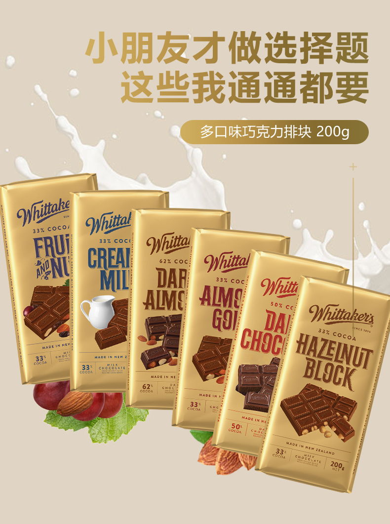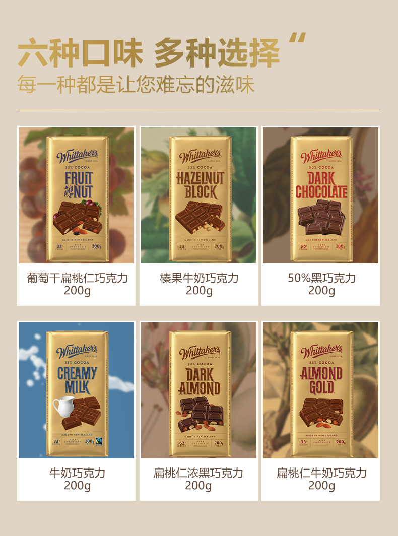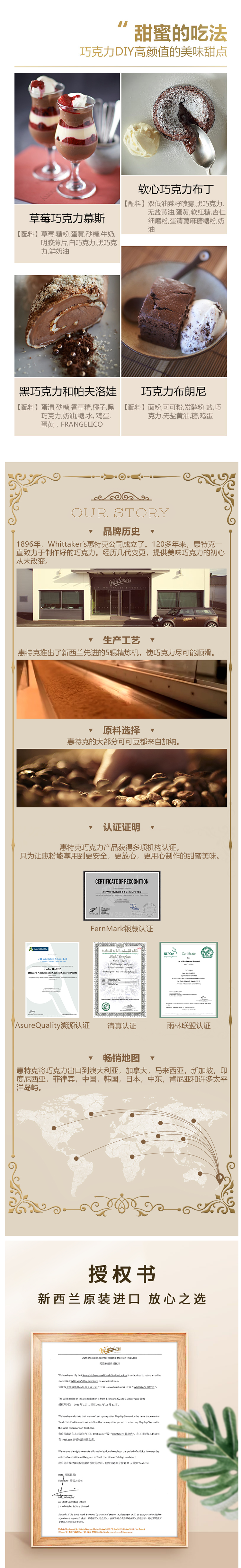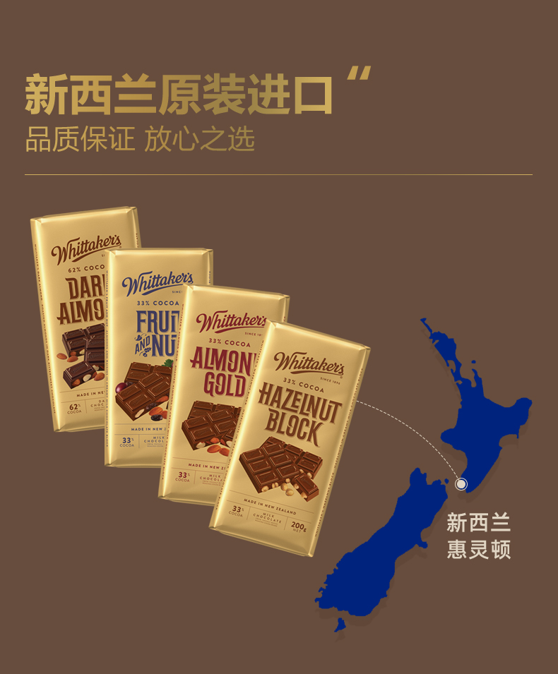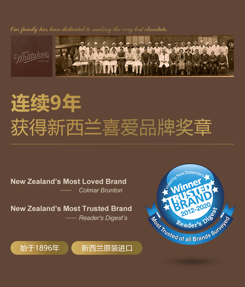 惠特克巧克力始创于1896年,由James Henry Whittaker在惠灵顿创立,深受新西兰人追捧,连续4年都以不小的优势获得了新西兰人最喜爱品牌的称号,目前再新西兰销量第一。