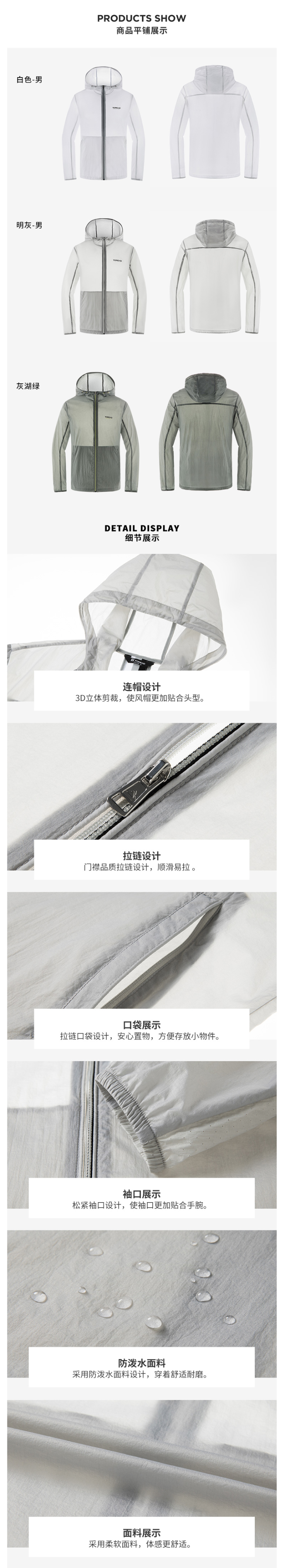 在款式上,合身版型,一体连帽设计,3D立体剪裁,使风帽更加贴合头型,松紧袖口,弹力松紧袖口贴合手腕不倒灌风。可把皮肤风衣自收纳为很小的体积,方便携带。