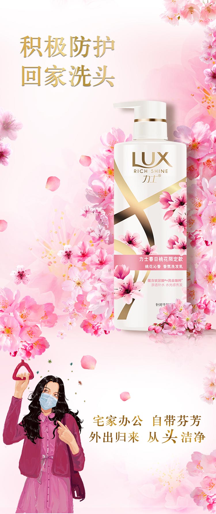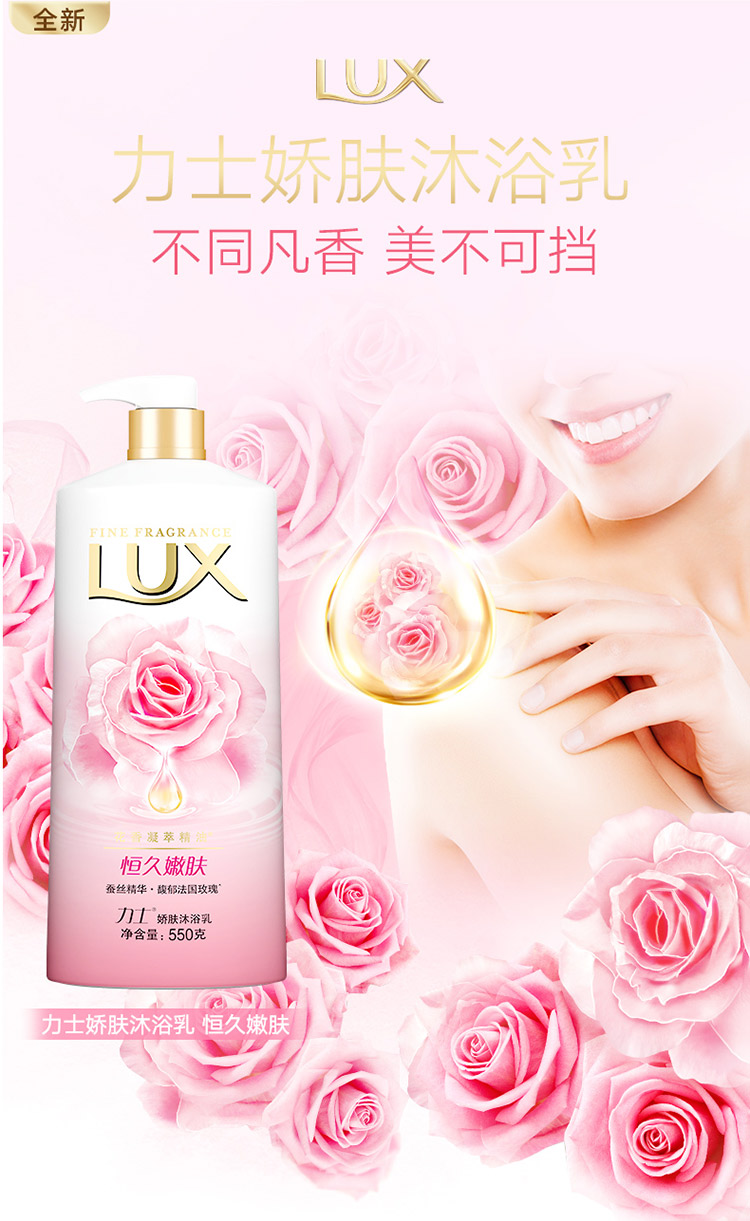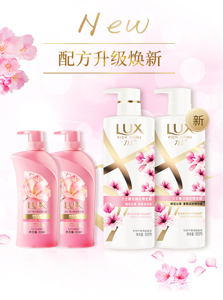 LUX力士是联合利华旗下个护品牌,其产品包括洗发乳,润发素,沐浴露和香皂等。这款桃花浅香香氛沐浴乳和洗发露,采用活花萃取科技,为你锁住鲜花盛放那一刹那的香气,含有花香凝萃精油和维C精华,配合清新香调,甜香四溢。细腻丰富的泡沫,萦绕全身~细腻棉滑感为肌肤带来持续呵护,时刻享受沐浴带来的愉悦宠爱。