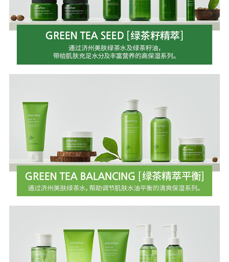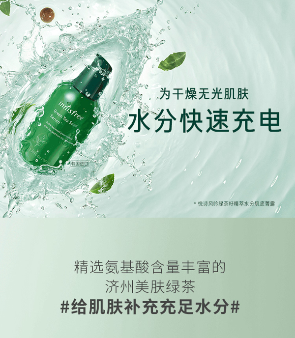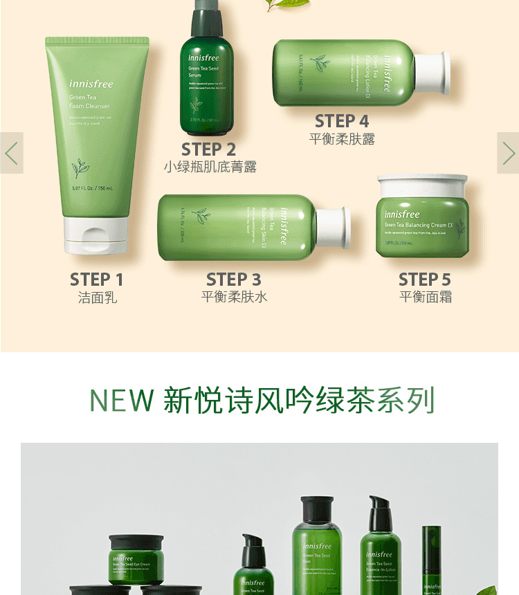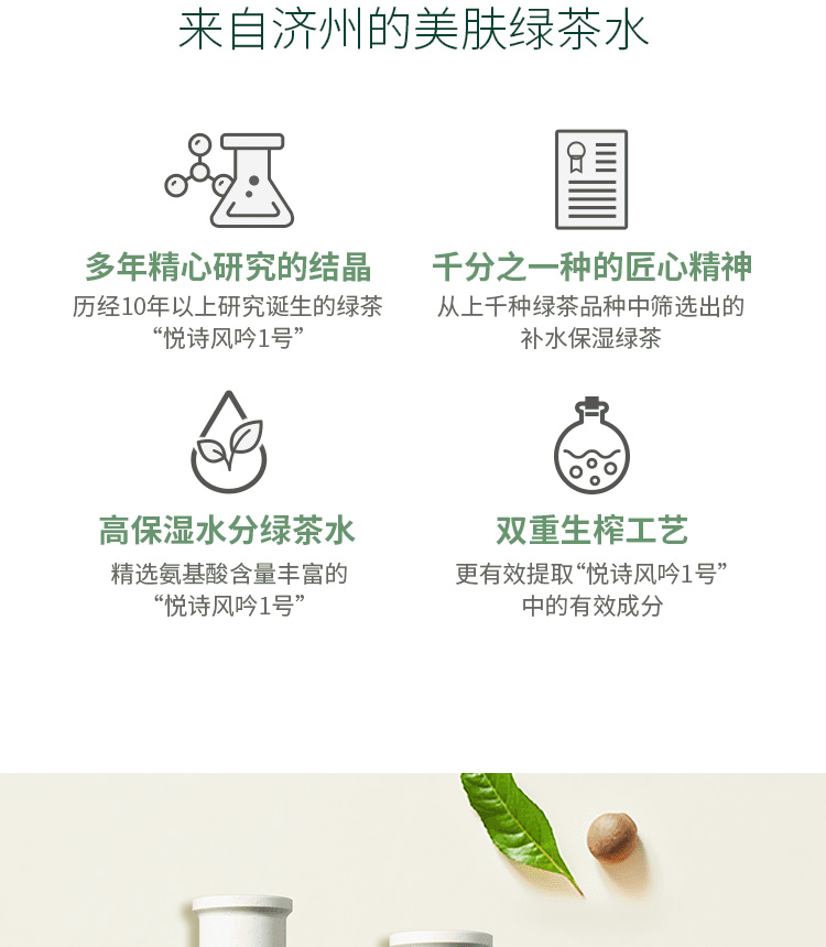 采用天然绿茶茶多酚,清除人体自由基,调节肌肤水油平衡,温润补水,清爽舒适易吸收,敏感肌也可用。悦诗风吟走的就是小清新风格,性价比高,味道清新淡雅,而且算是在中国叫的比较响的化妆品牌子了,简单实用。