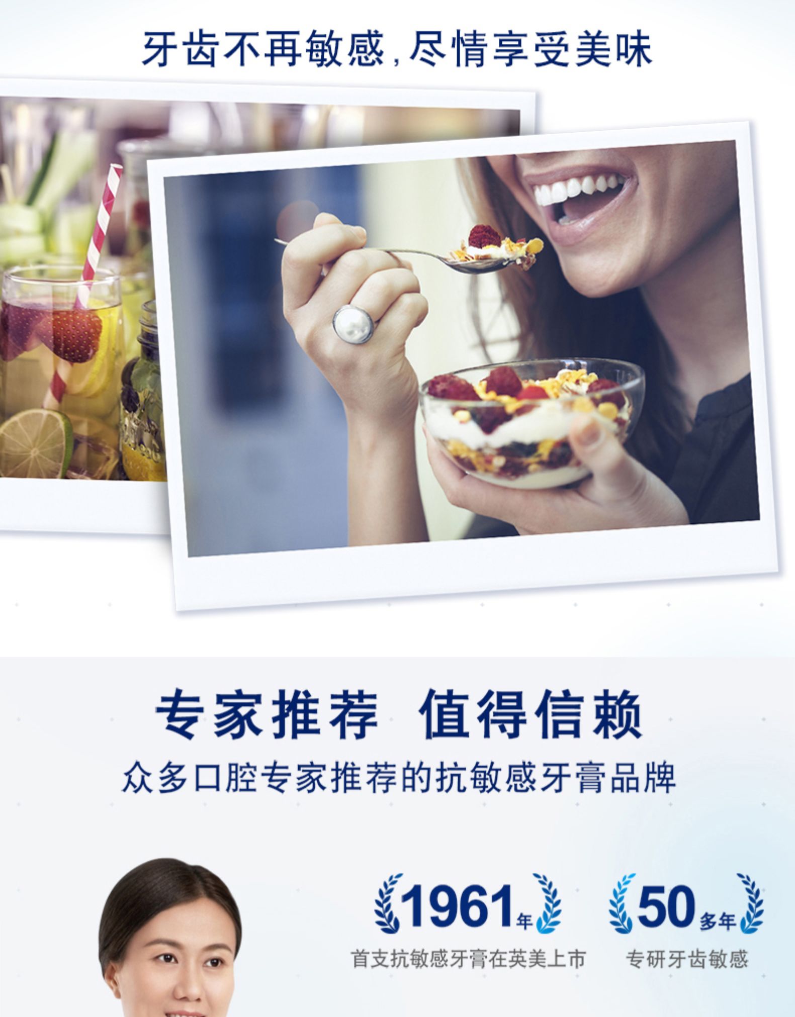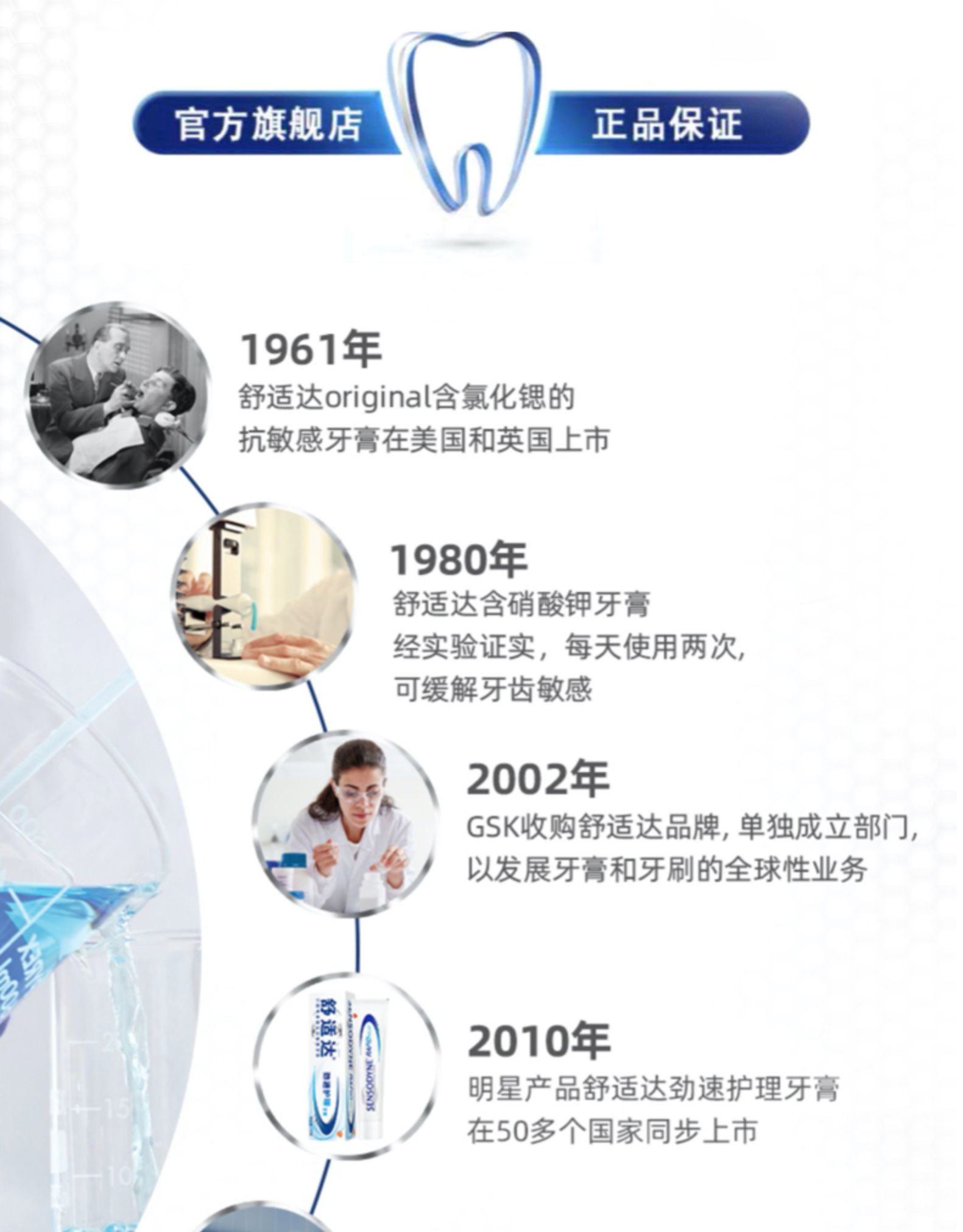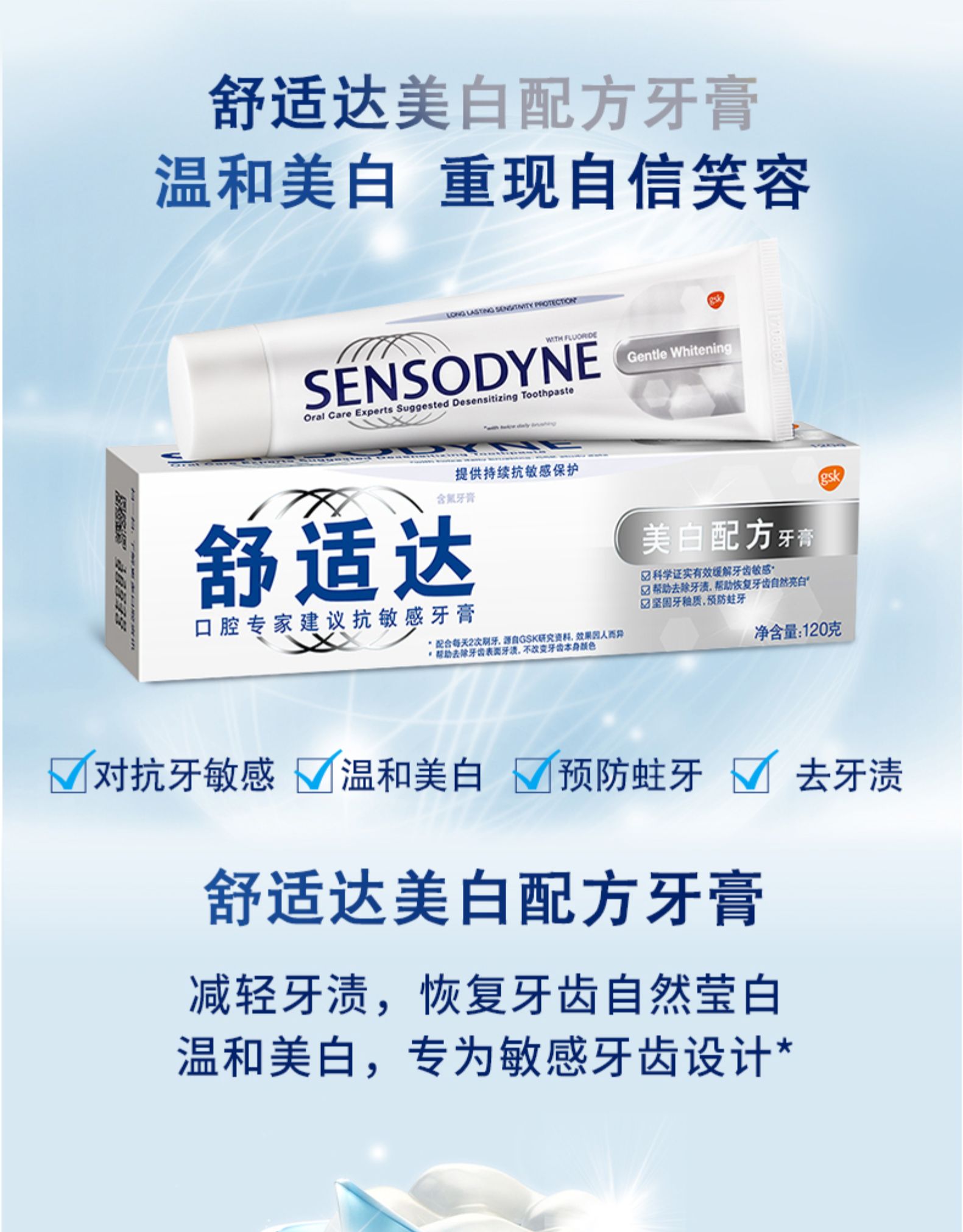 葛兰素史克旗下品牌SENSODYNE舒适达的牙膏有口皆碑,是专业的抗敏感牙膏品牌,受到很多牙医的推崇。这款舒适达专业修复牙膏,采用NovaMin®专利科技,遇到唾液能释放出钙和磷酸盐,在牙本质上形成修复层,有益于修复敏感牙齿受损部位,帮助预防牙齿敏感疼痛 。