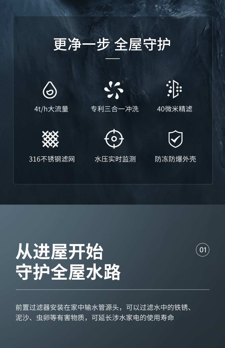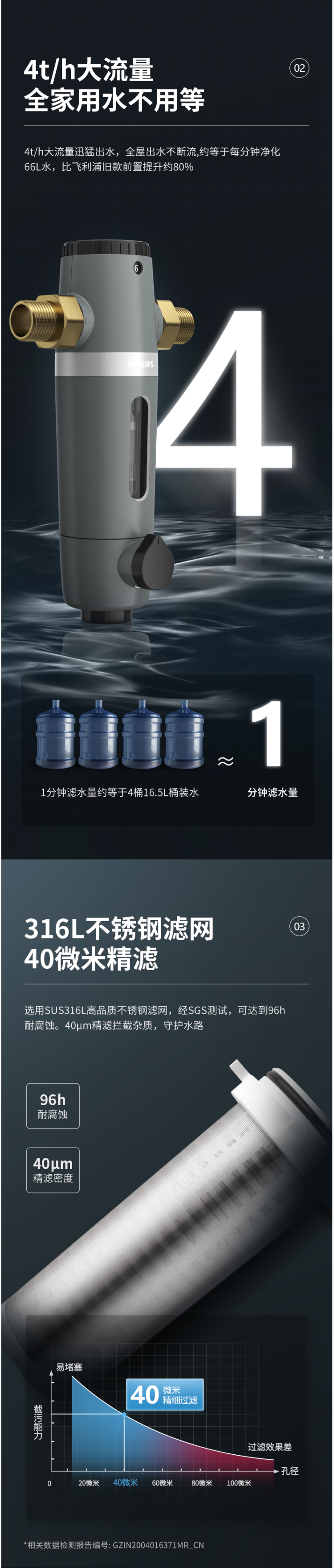严选经过国际权威SGS检测机构认证的高品质316不锈钢滤网,精度40微米,不易堵塞,耐腐蚀,使用寿命长,4T/h大通量,水量充足,满足全家用水无需等待。