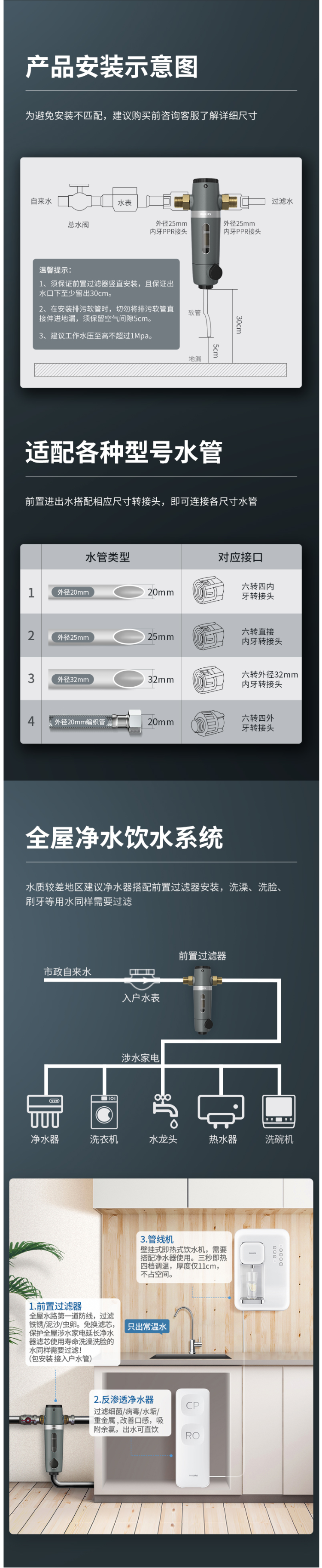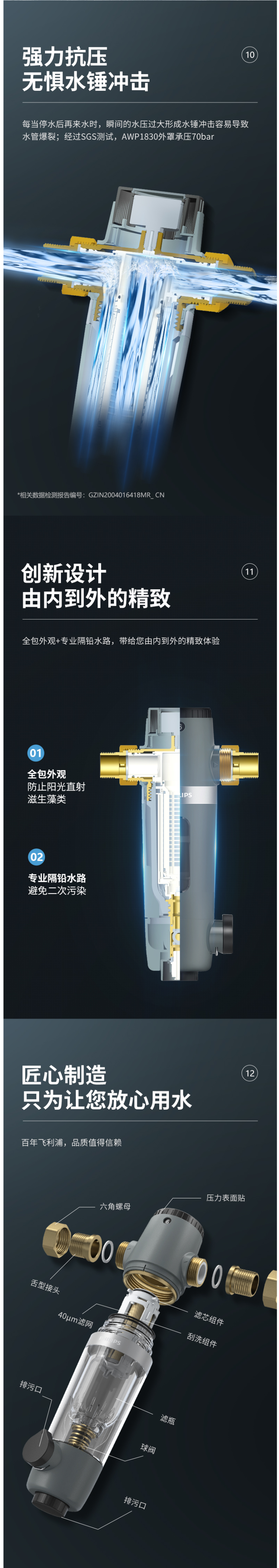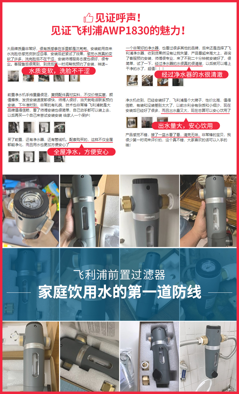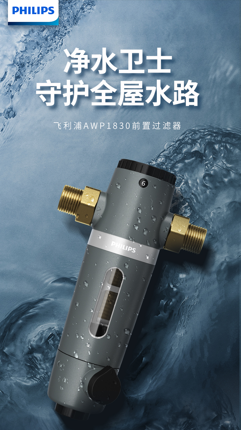 这款飞利浦 前置过滤器,食品级安全材质,专利隔铅水路设计+高品质无铅黄铜,打造无铅机身,杜绝二次污染保护全家用水健康。全包外观,避免安装阳光直射处造成藻类滋生。