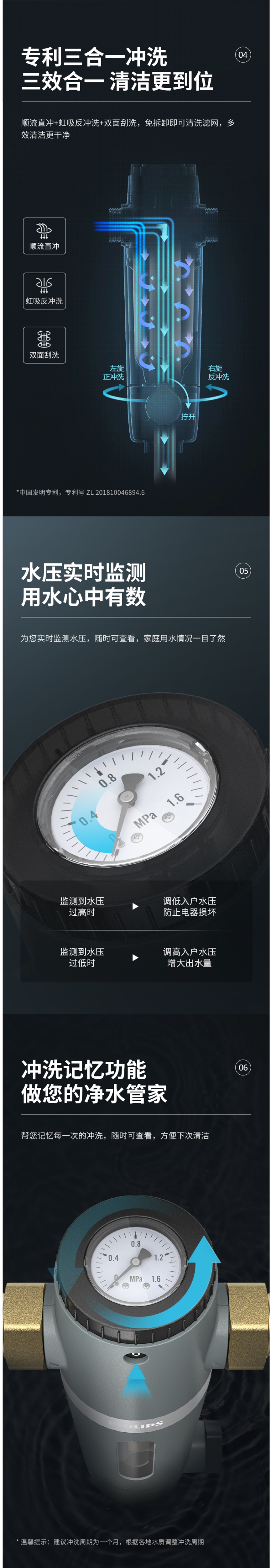 3 有冲洗记忆+水压检测,家庭用水情况一目了然,便于打理。