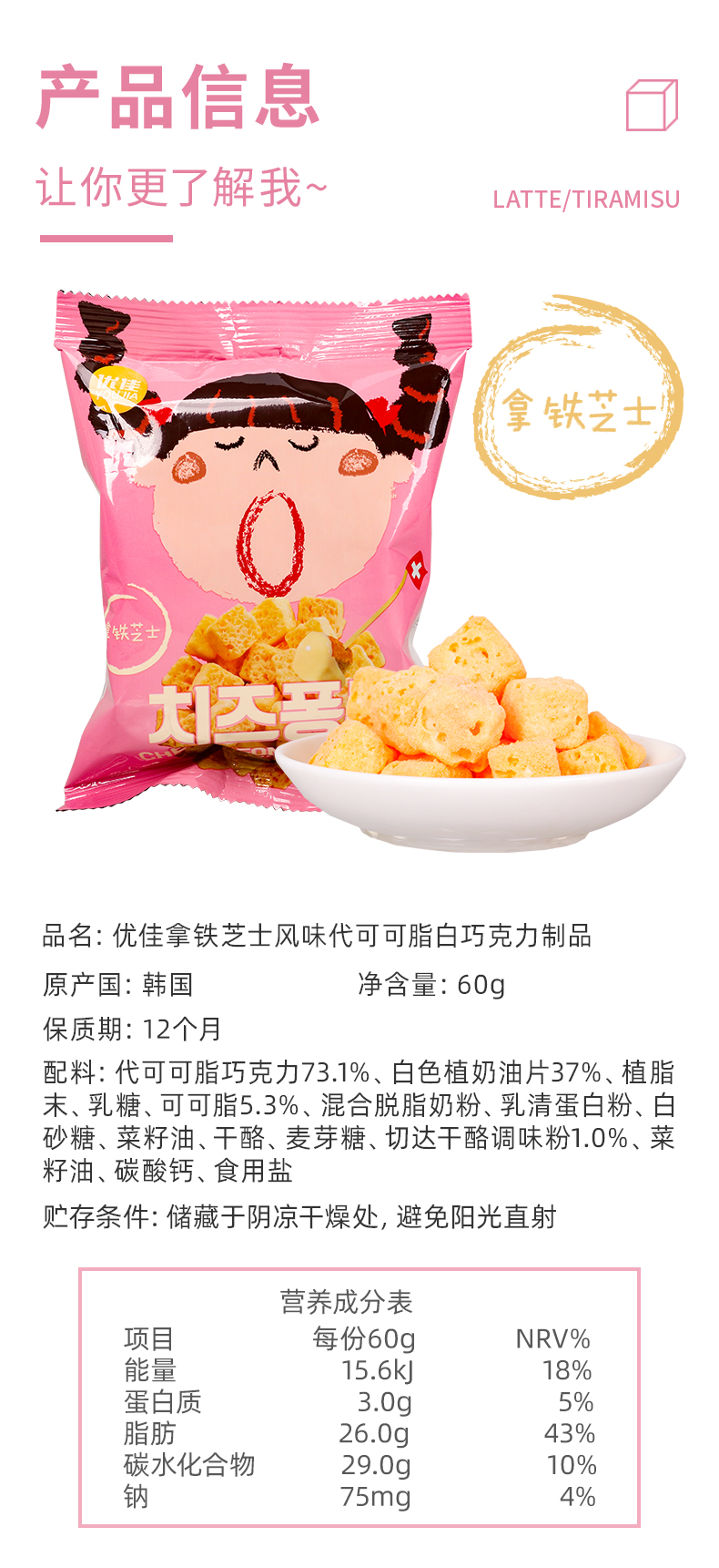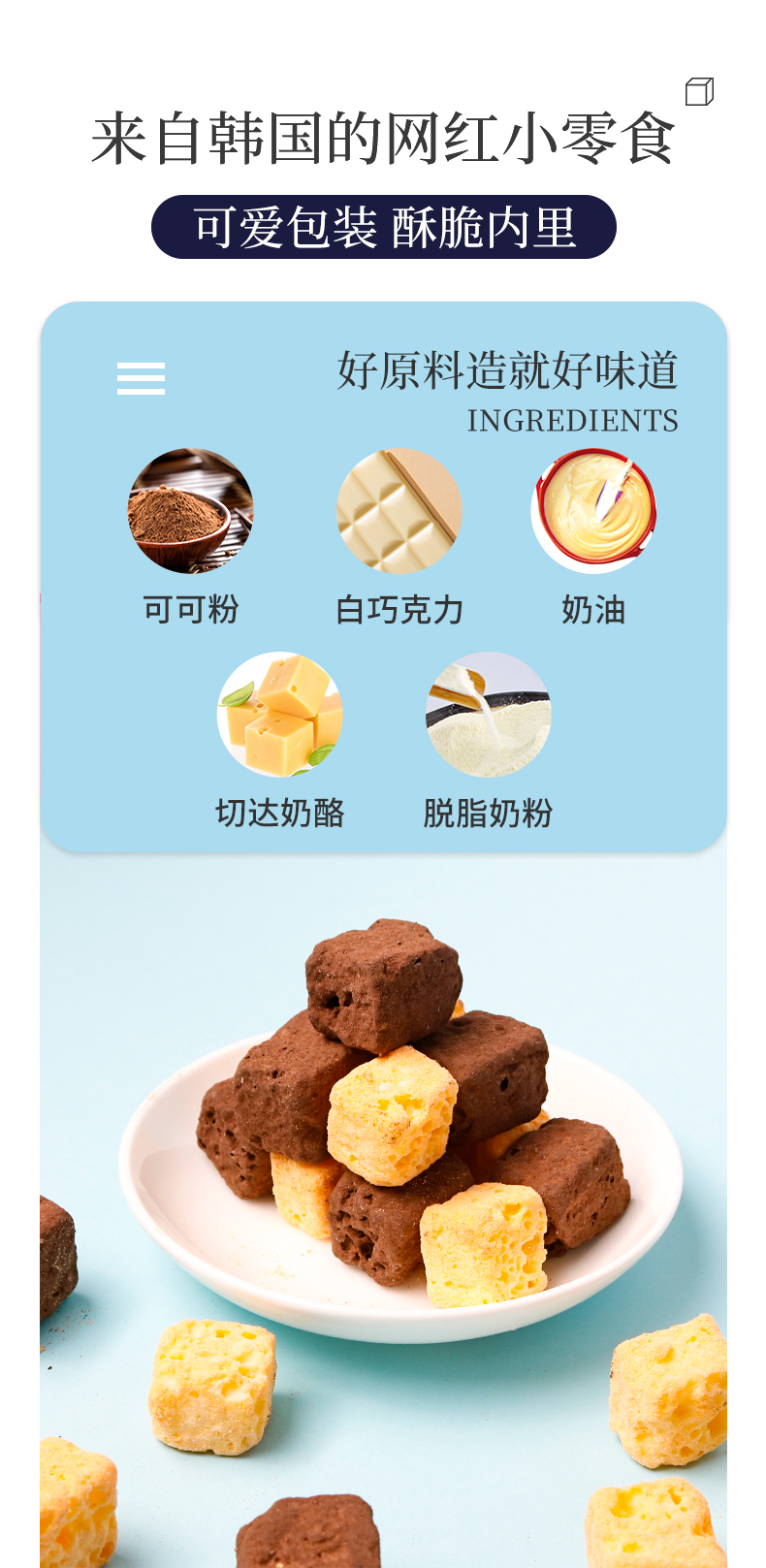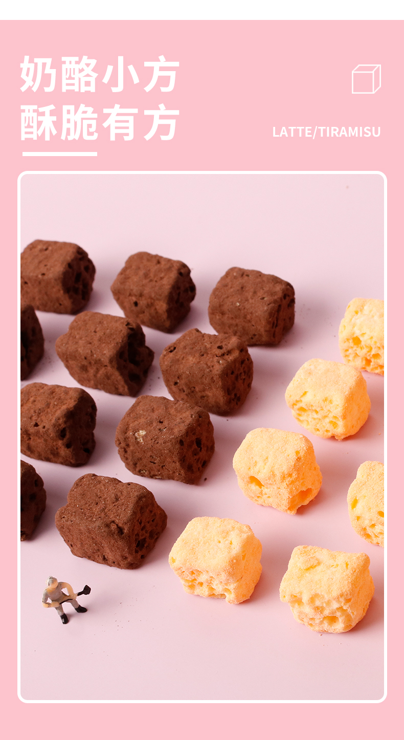 这款优佳奶酪块,使用可可粉、白巧克力、奶油、切达奶酪、脱脂奶粉为原料,低温烘焙而成,伴随着浓郁奶味,酥脆内里,满口奶香。