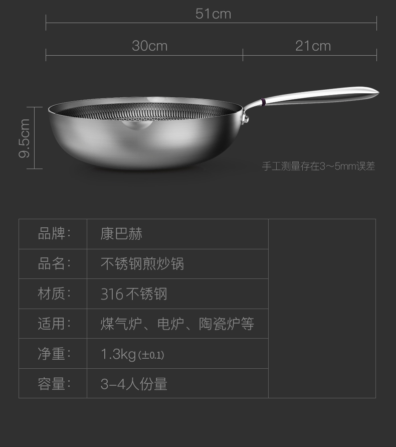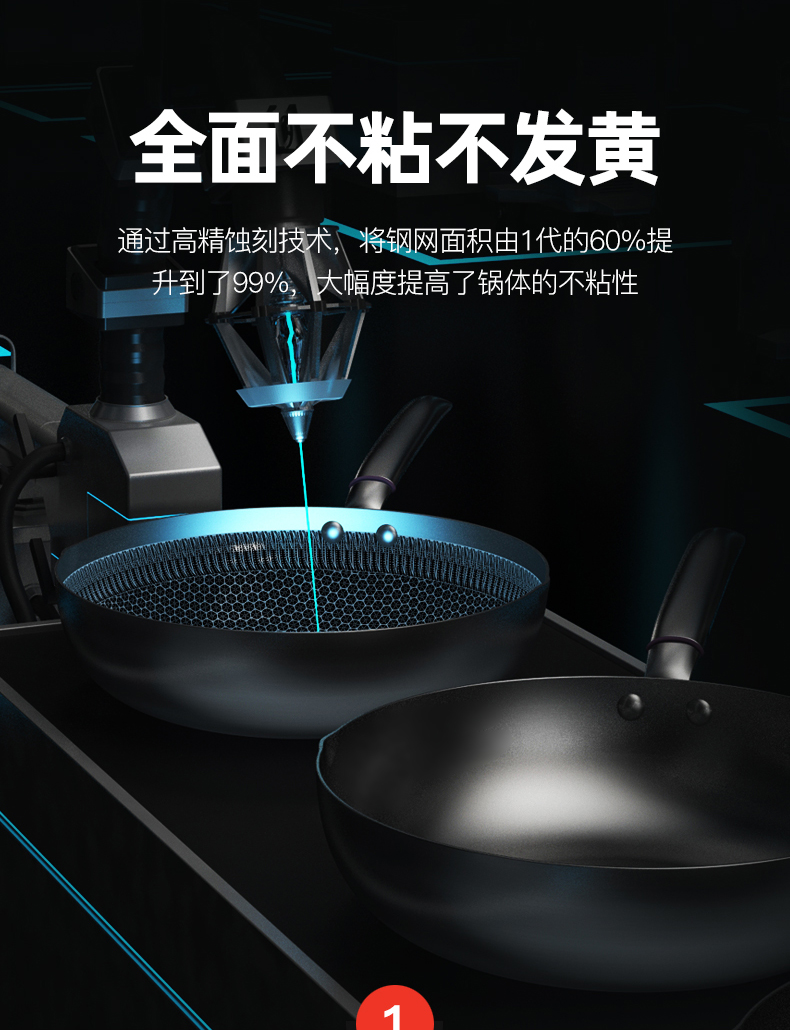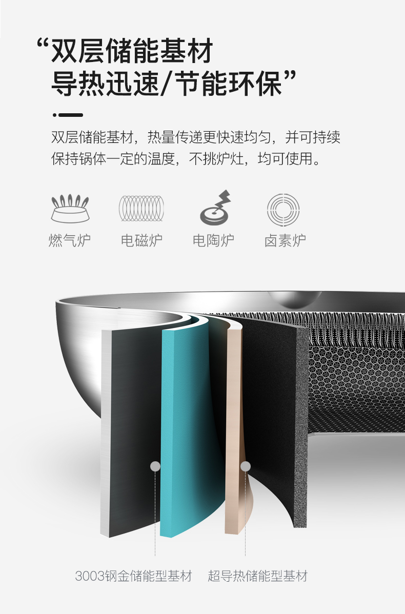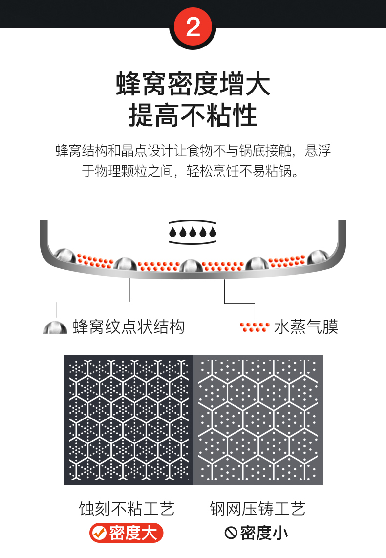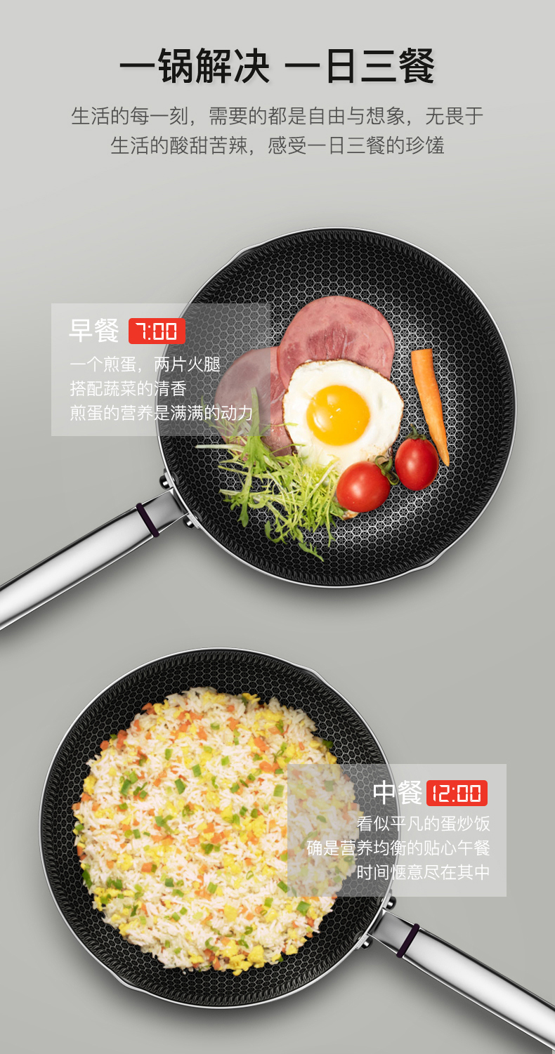 内层蜂窝纹理和精雕技术,不怕剐蹭,锅底不发黄,一擦即净,方便清理。锅底为双层储能基材,升温迅速且均匀,不挑炉灶,燃气灶、电磁炉等都适用。9.5cm锅深设计,煎炒蒸煮都能实现。把手与锅身为加固铆钉,坚固耐用。