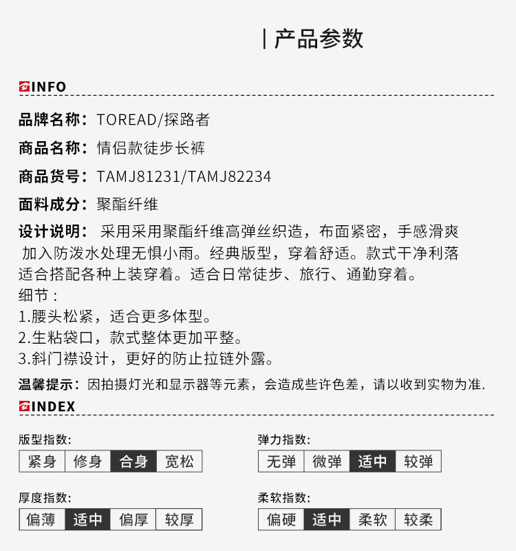 这款探路者男防泼水户外休闲裤,是2021年春夏新款,采用100%聚酯纤维面料,摸起来的手感柔软爽滑,抗撕裂耐磨损,表面还加持了防泼水处理,无惧小雨。