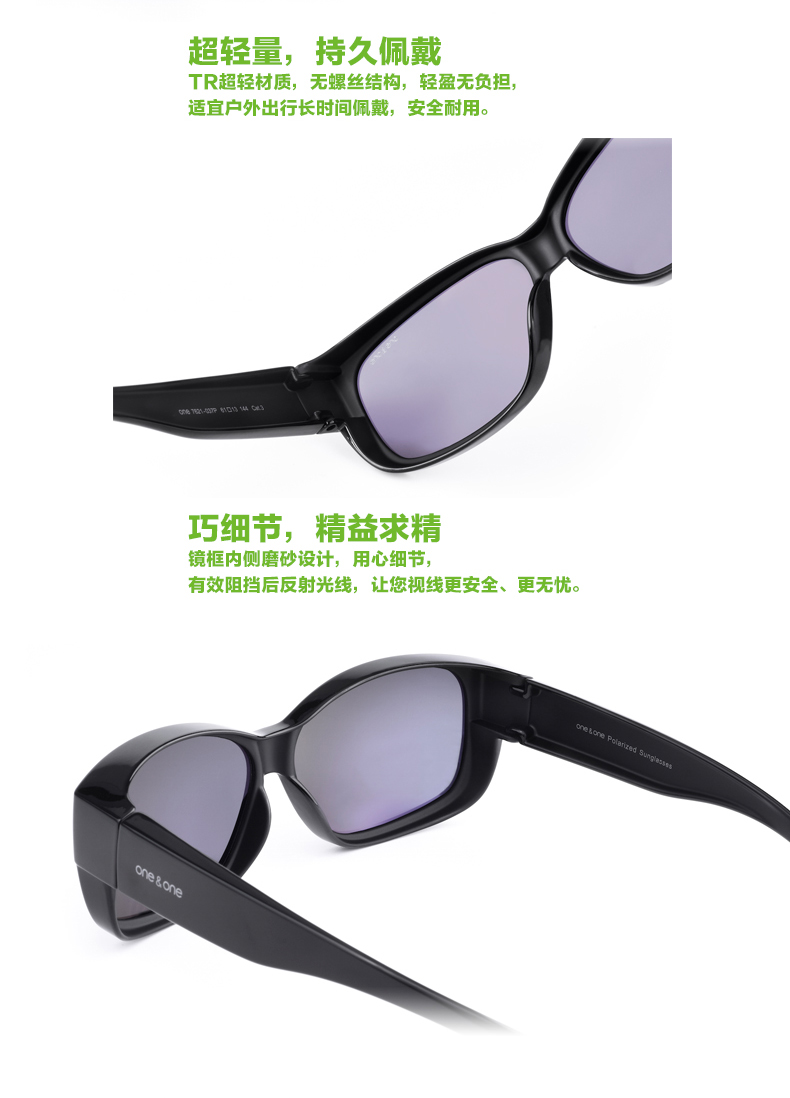 one&one的偏光套镜让近视人群可以轻松享受阳光视觉,解决近视人群的视觉烦恼。在线下占据近视太阳镜绝大部分的市场,是近视人群不可或缺的功能产品。