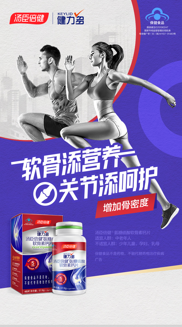 健力多是汤臣倍健旗下骨骼营养品牌,这款汤臣倍健 Keylid 健力多 新升级 氨糖软骨素钙片,规格为1.2g×48片,新品上市。全新升级五大配方:D-氨基葡萄糖硫酸钾盐、硫酸软骨素钠、碳酸钙、酪蛋白磷酸肽、鸡软骨提取物;营养更高、硫酸软骨素含量更高,还富含II型胶原蛋白和透明质酸。在一定程度上抑制关节中胶原降解,对受损软骨组织进行修复,对关节软骨起到润滑、营养、保护作用。服用方法:每次2粒,每日2次,随餐服用,或遵医嘱。