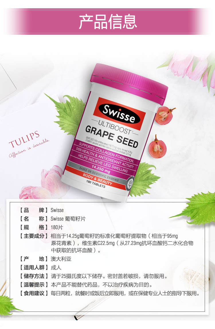这款Swisse 葡萄籽片,澳大利亚原装进口,精选高含量葡萄籽多酚的优质葡萄,高吸收利用率,超强抗氧化,有助于推迟或减少色斑、皱纹的出现,减轻辐射对皮肤的影响,爱美的女士、长期对着电脑、熬夜的上班族都可以尝试一下。