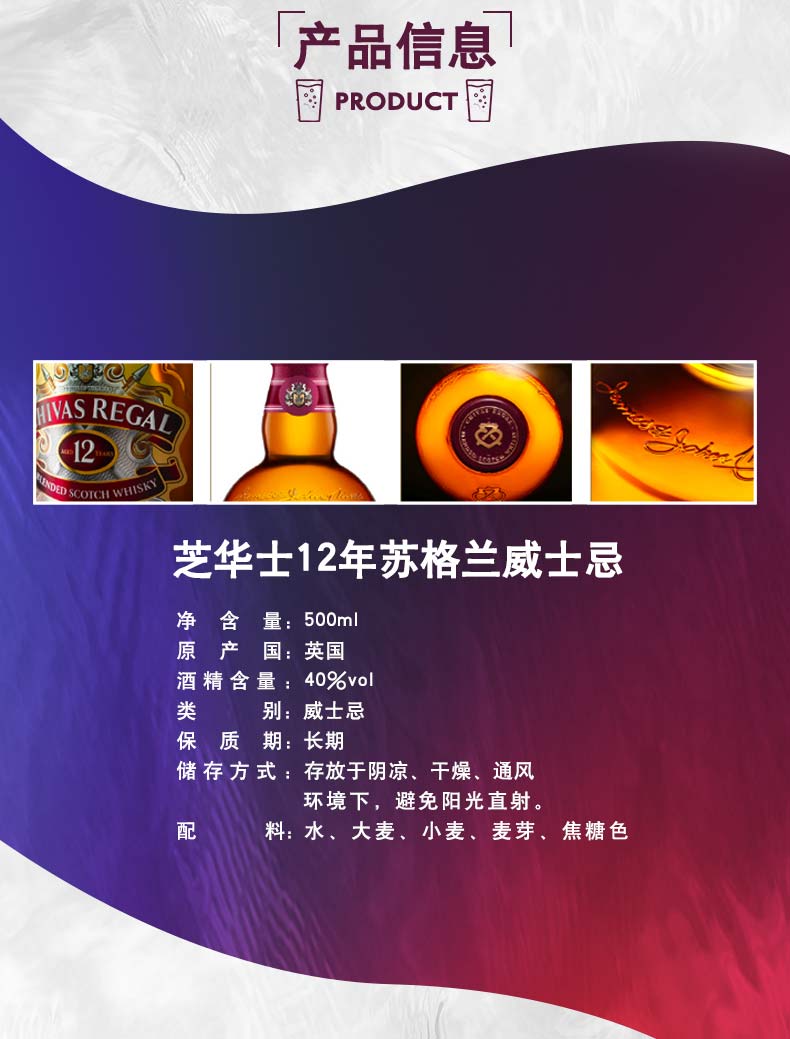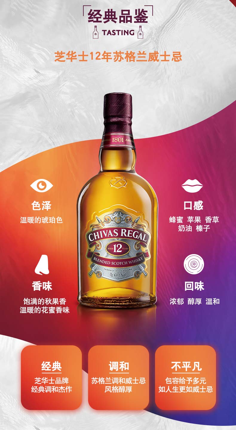作为英国人的国酒,威士忌随着日不落帝国走向世界,而芝华士12年以的特佳酒质,成为举世公认衡量优质苏格兰威士忌的标准。醇和,浓郁的苹果和带有甜味的花香,伴随温和的干果味。口感醇厚、丰满、柔和,无论在世界何时何地,都是人们欢聚分享,举杯共饮时必不可少的一部分。