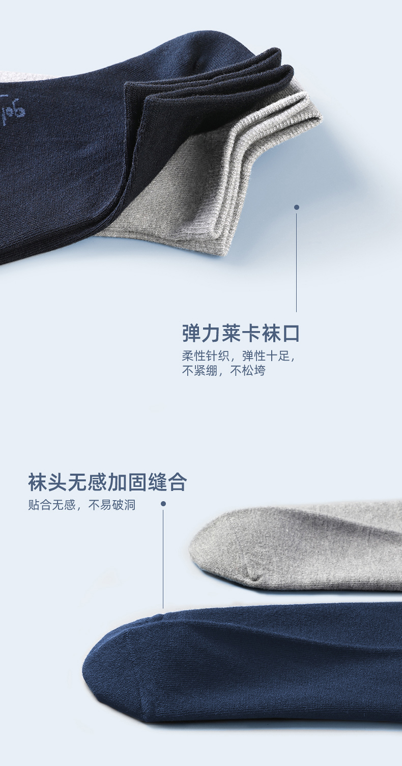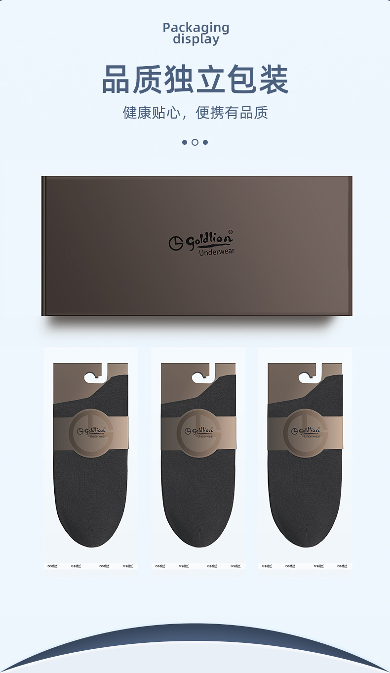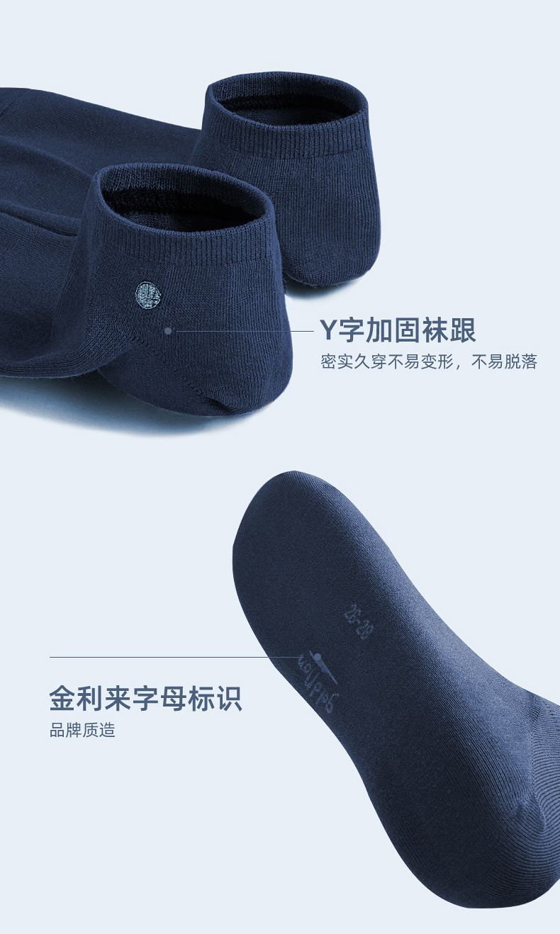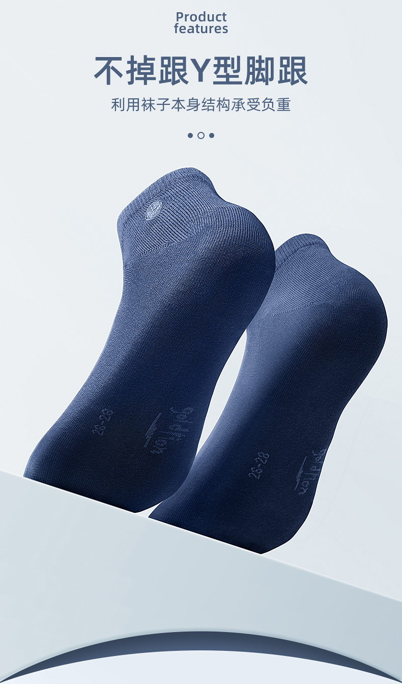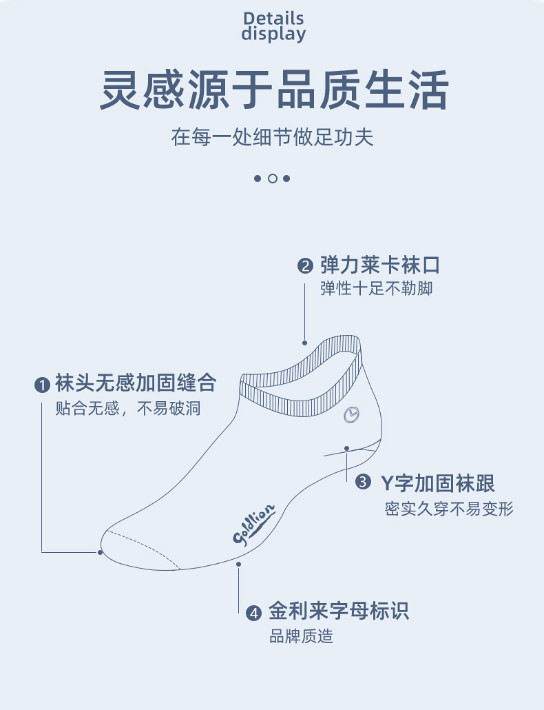设计上也是按照高端品质男袜来做的,无凸手工缝合袜头,平整无摩擦力,莱卡弹力袜口,舒适不勒且不下滑,后跟做成3D立体Y跟,贴合脚后跟,牢固度好,不易掉。