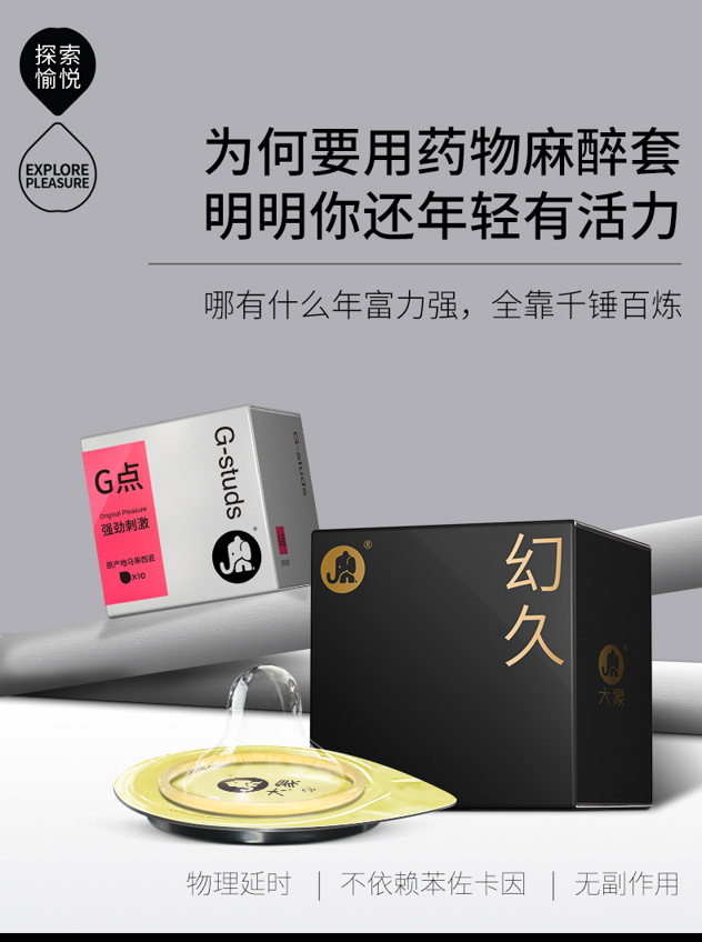 这款幻久003避孕套是大象最新开发的一款套套,采用纯物理延时,减少了对苯佐卡因的依赖,在套套顶部做了加厚设计,让你的小兄弟受的刺激轻一点,从而达到持久的效果,套身依旧薄至0.03,不影响舒适体验。
