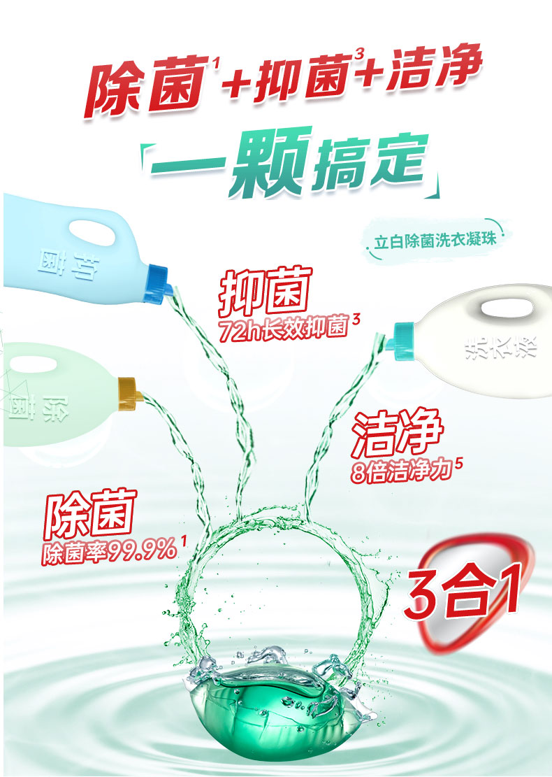 99.9%除菌率 72小时长效抑菌 8倍洁净力。一颗洗一桶比买洗衣液还划算,8倍清洁力一盒可洗500件。