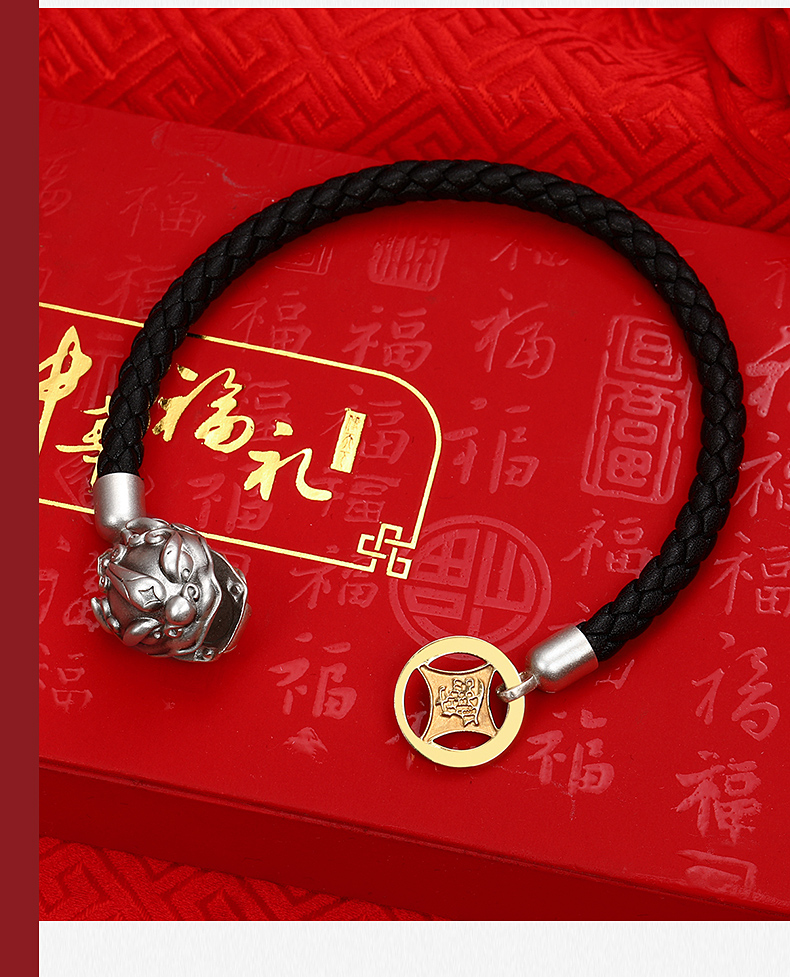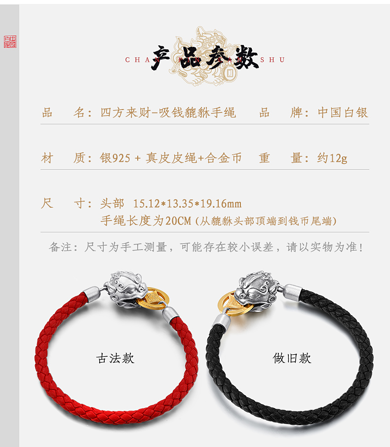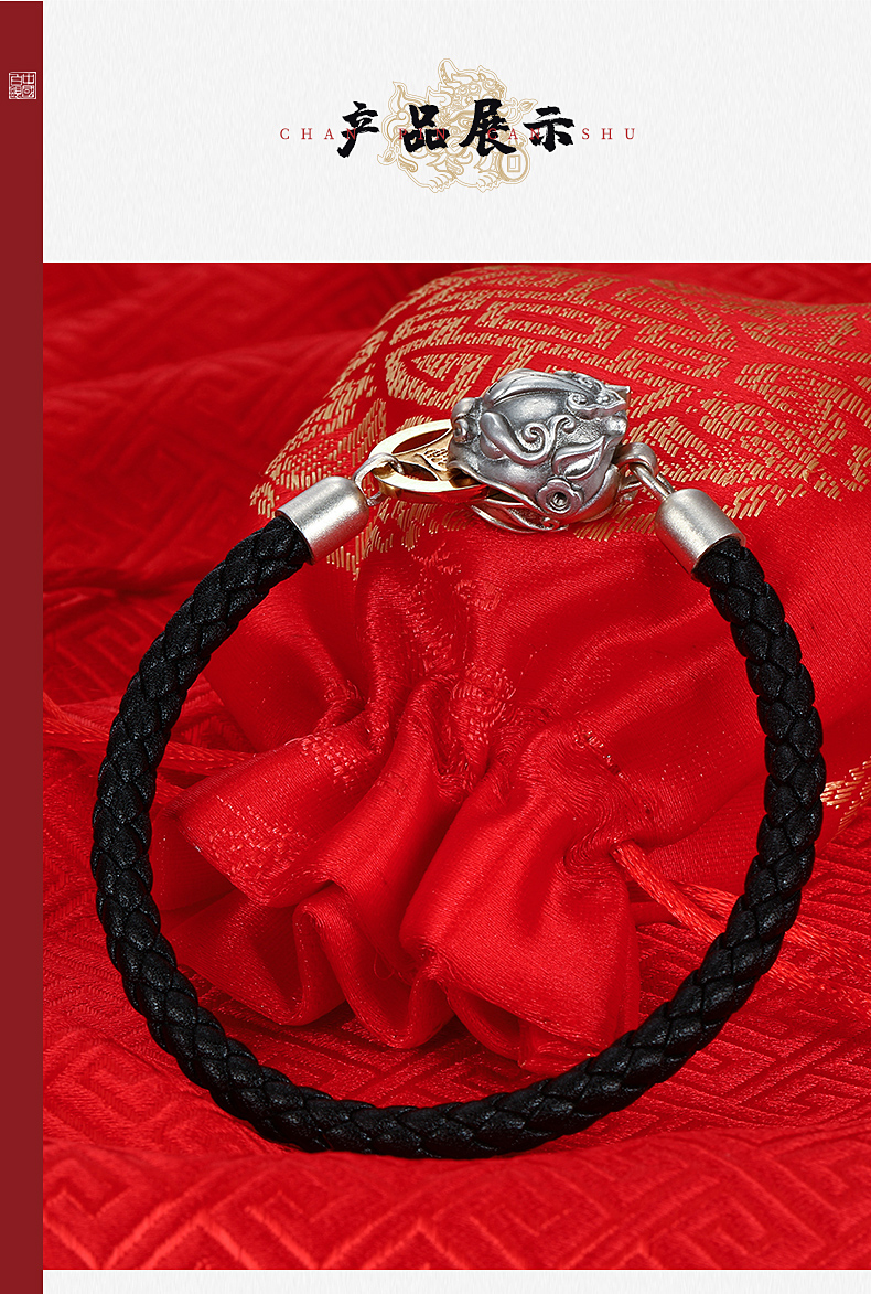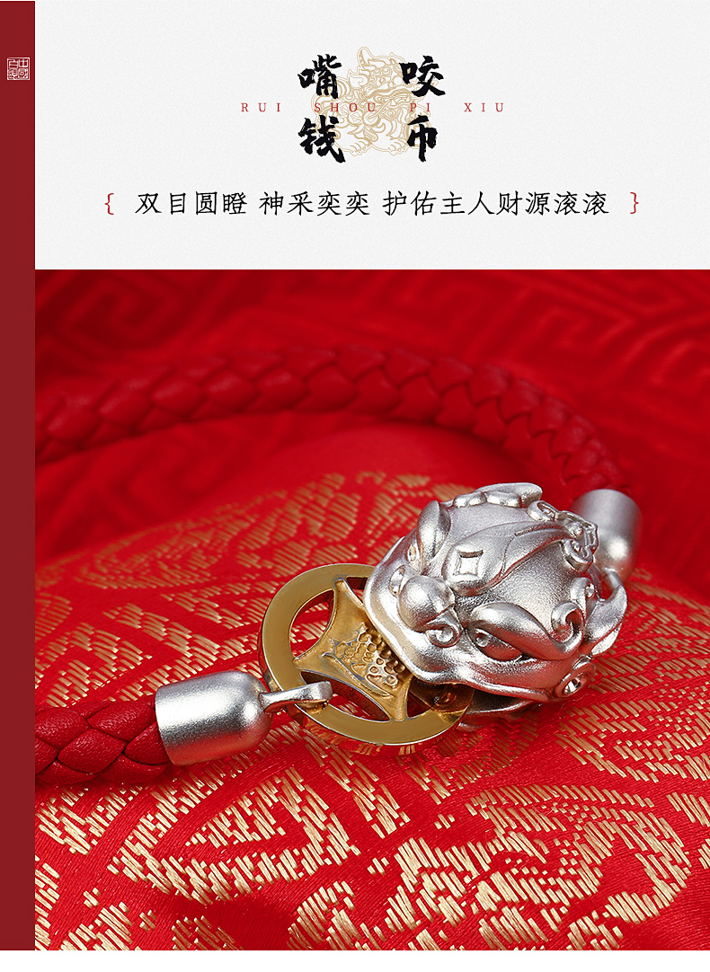 中国白银吸财貔貅925银饰磁吸手串,材质:925银+真皮皮绳+合金币,重量约12g;手串头尾连接处采用新型专利技术,在貔貅内部固定设有圆环形磁铁,硬币被吸引于貔貅嘴部位置,寓意“吸财”。