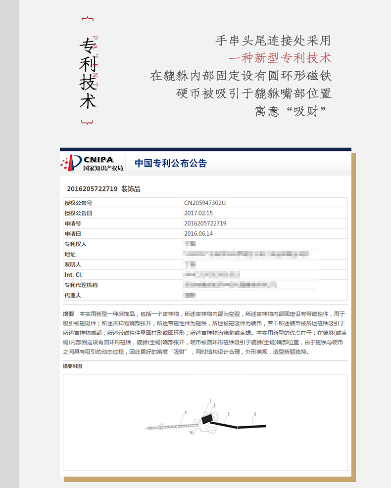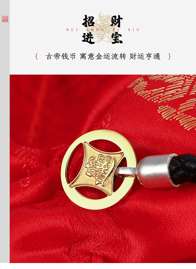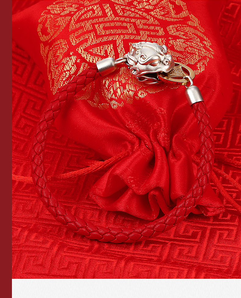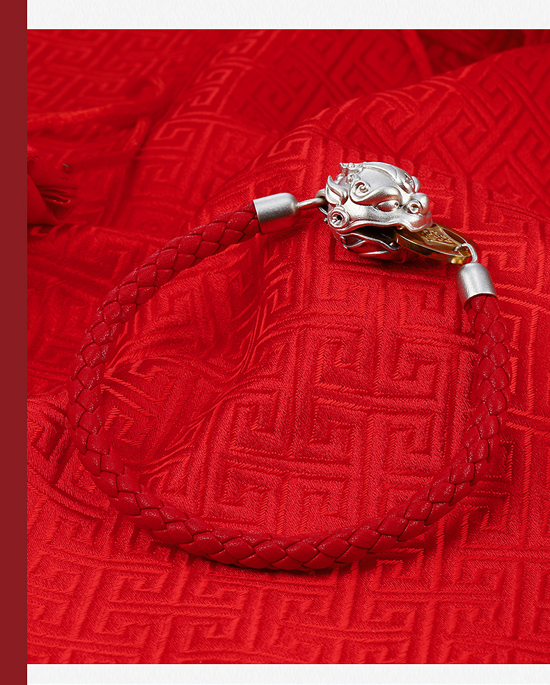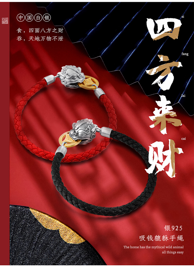 中国白银吸财貔貅925银饰磁吸手串,材质:925银+真皮皮绳+合金币,重量约12g;手串头尾连接处采用新型专利技术,在貔貅内部固定设有圆环形磁铁,硬币被吸引于貔貅嘴部位置,寓意“吸财”。