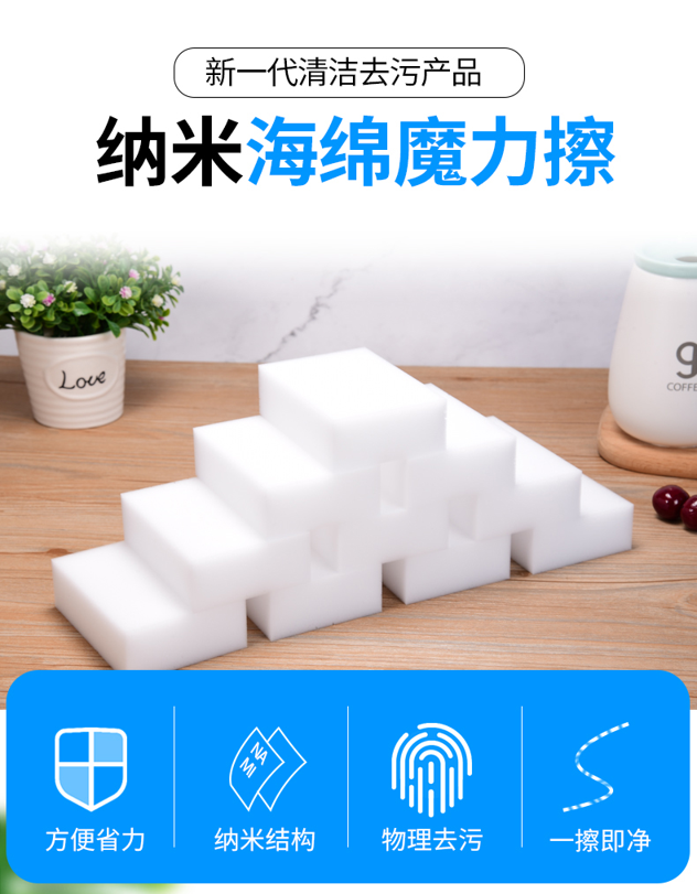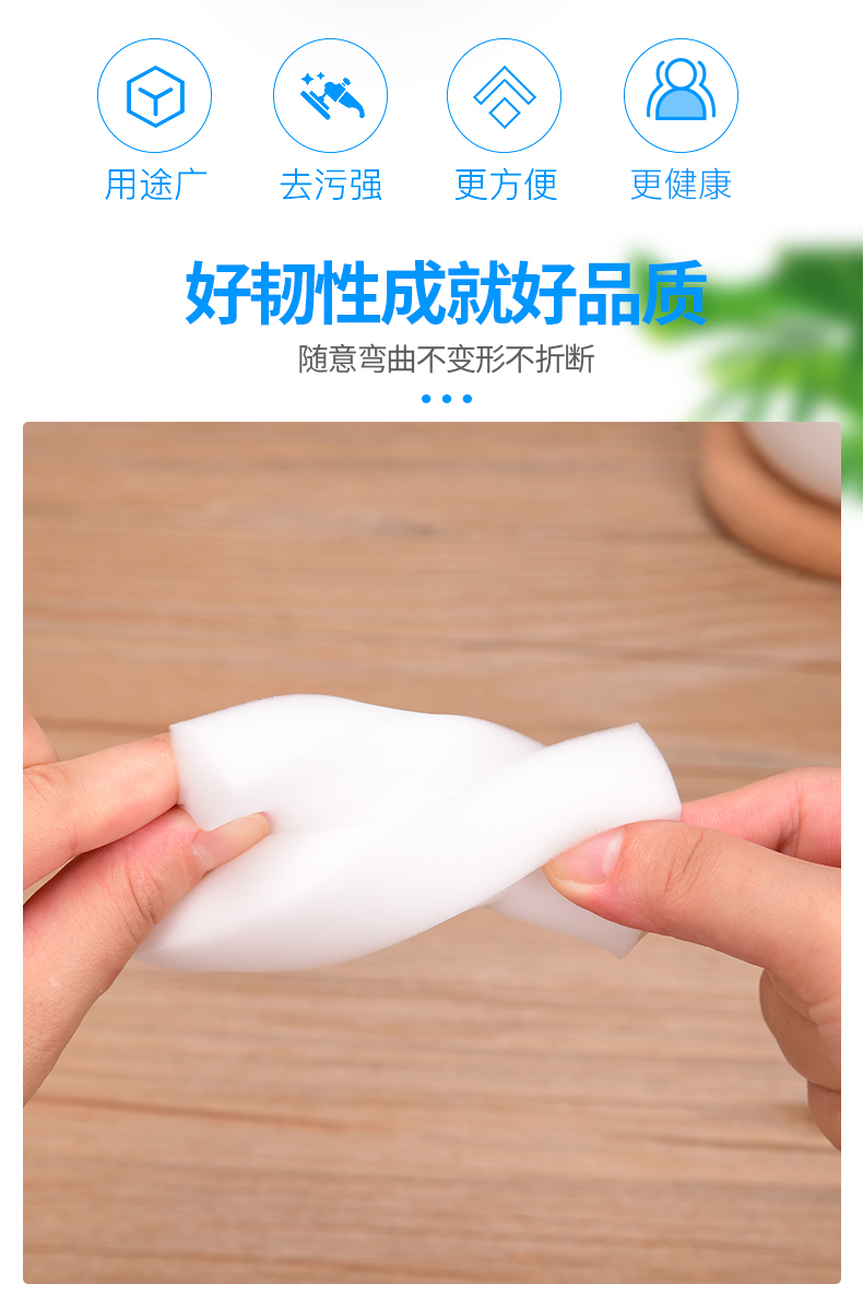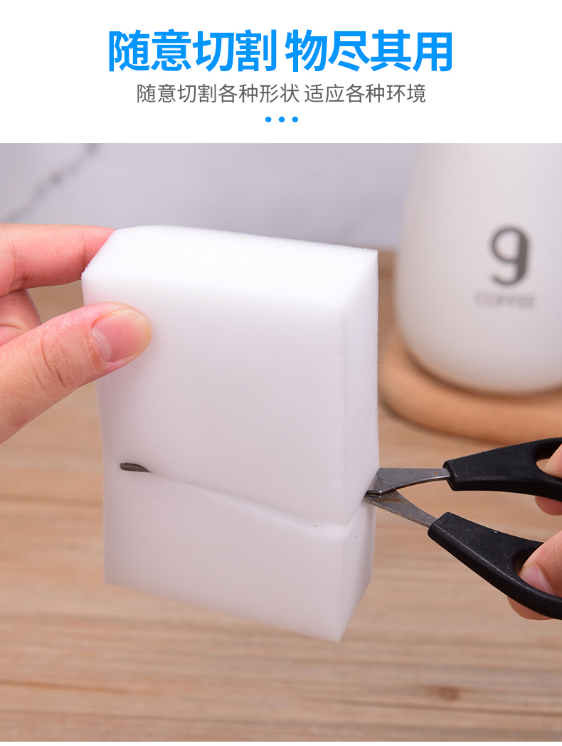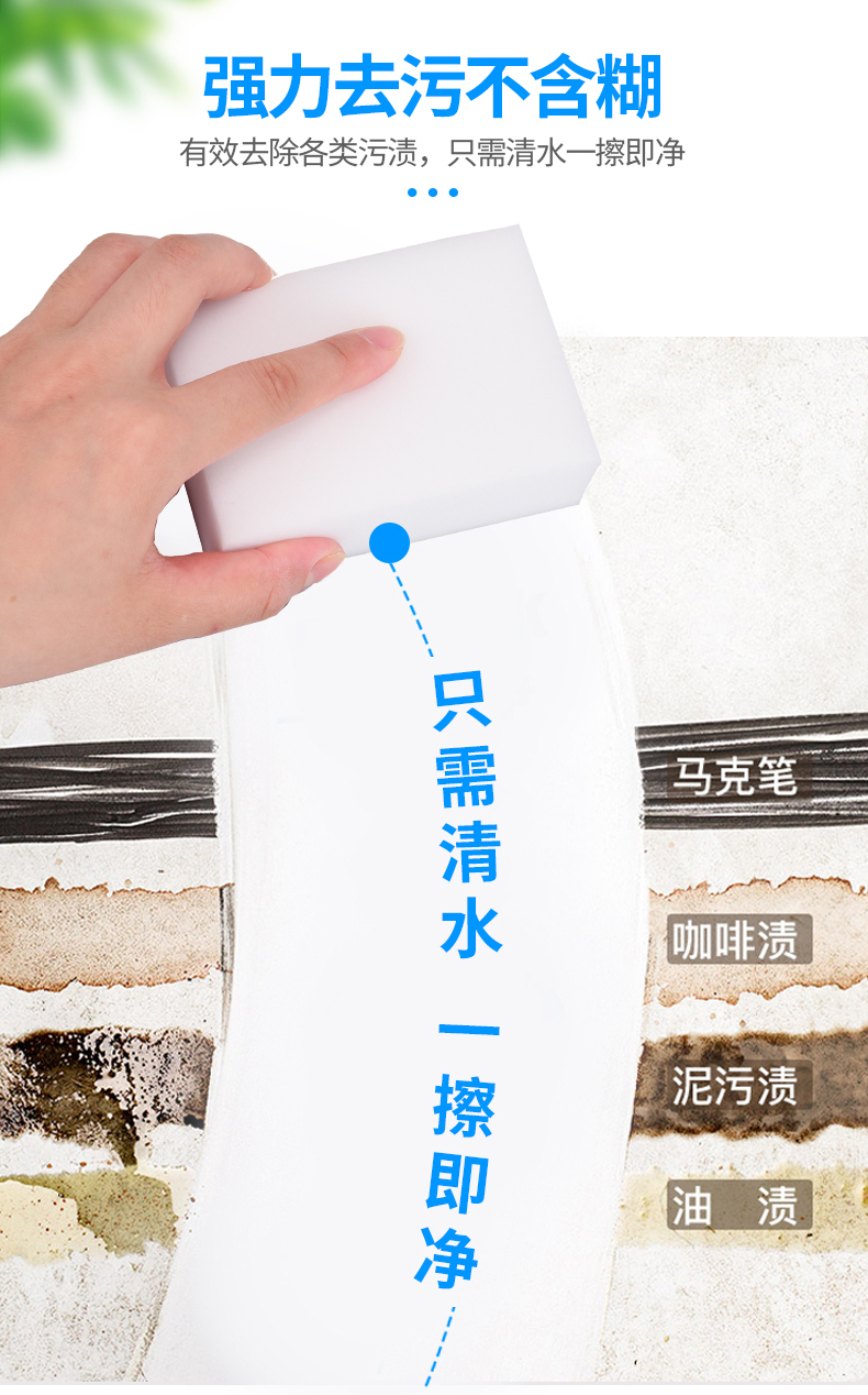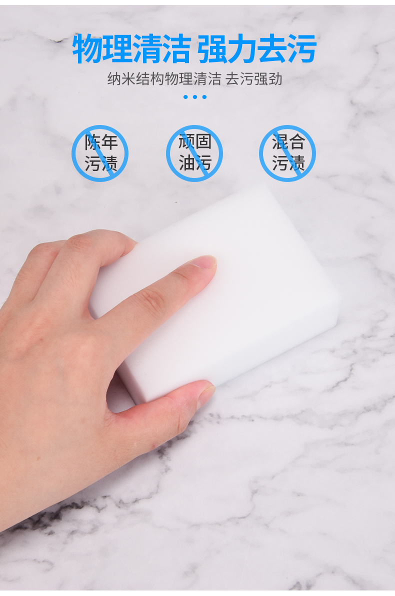 清洁原理:魔术擦是一种三聚氰胺海绵,易碎,具有多孔三维网状结构,吸附性能极好,通过摩擦就会从泡沫表面分离并分散成细微颗粒,将污渍擦下并有效的吸附进泡沫孔隙中,具有很好的清洁能力。为进一步增强清洁效果,在海绵中也会加入洗涤助剂。