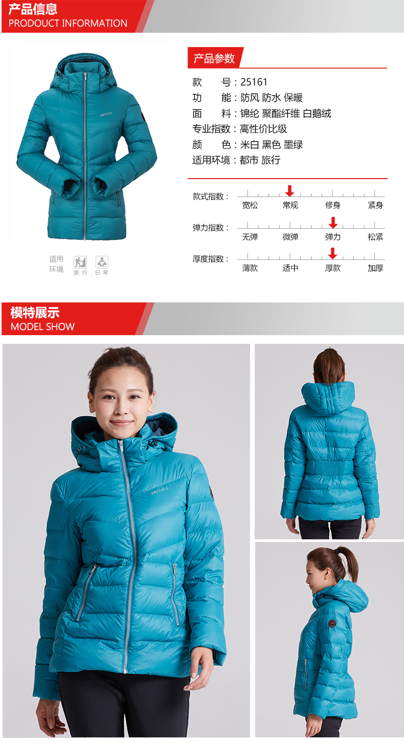 在款式和细节上,修身版型,后腰部分添加了橡皮筋设计,上身更加显瘦。帽子可拆卸,可调节松紧搭配高领设计,更加贴合保暖。弹力防风袖口,防止倒灌冷风,门襟是YKK拉链。