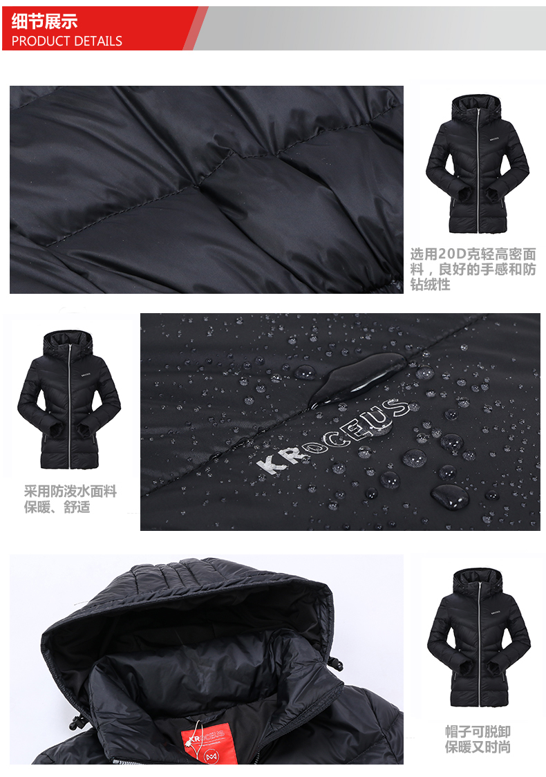 拒水羽绒是未来中高端羽绒制品的趋势,经过杜邦特氟龙处理的羽绒具有疏水性,不易被打湿。在潮湿环境下连续多天穿越,不能晒衣服的情况下,拒水羽绒受潮影响更小,可以保持比普通羽绒更高的蓬松度。即使衣物被打湿,拒水羽绒也不容易湿成一团,拒绝失温,保护生命!