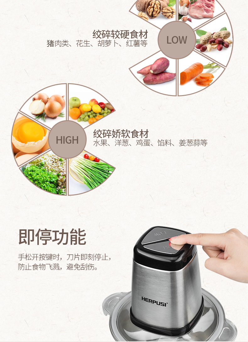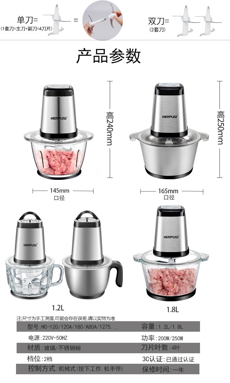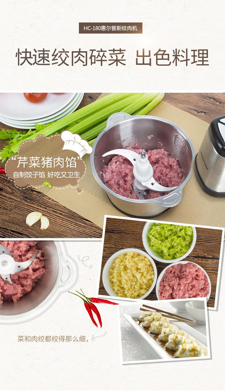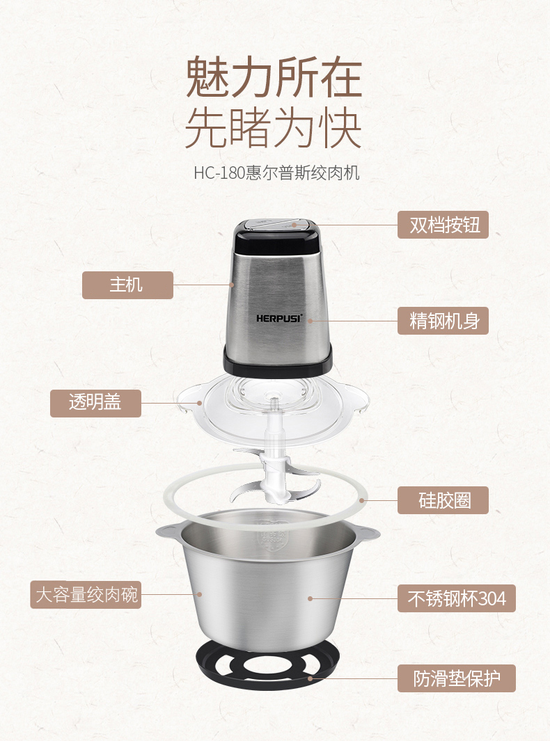 天猫herpusi旗舰店69.8元,可领30元优惠券,实付39.8元到手,第一款1.2L 配1个刀头此价。此外还有1.8L款和不锈钢款可选,略有差价。居家厨房小帮手,绞肉、碎菜,包饺子、制作儿童辅食轻便有好用。快慢两档,6秒速绞肉,易冲洗好打理,居家必备。