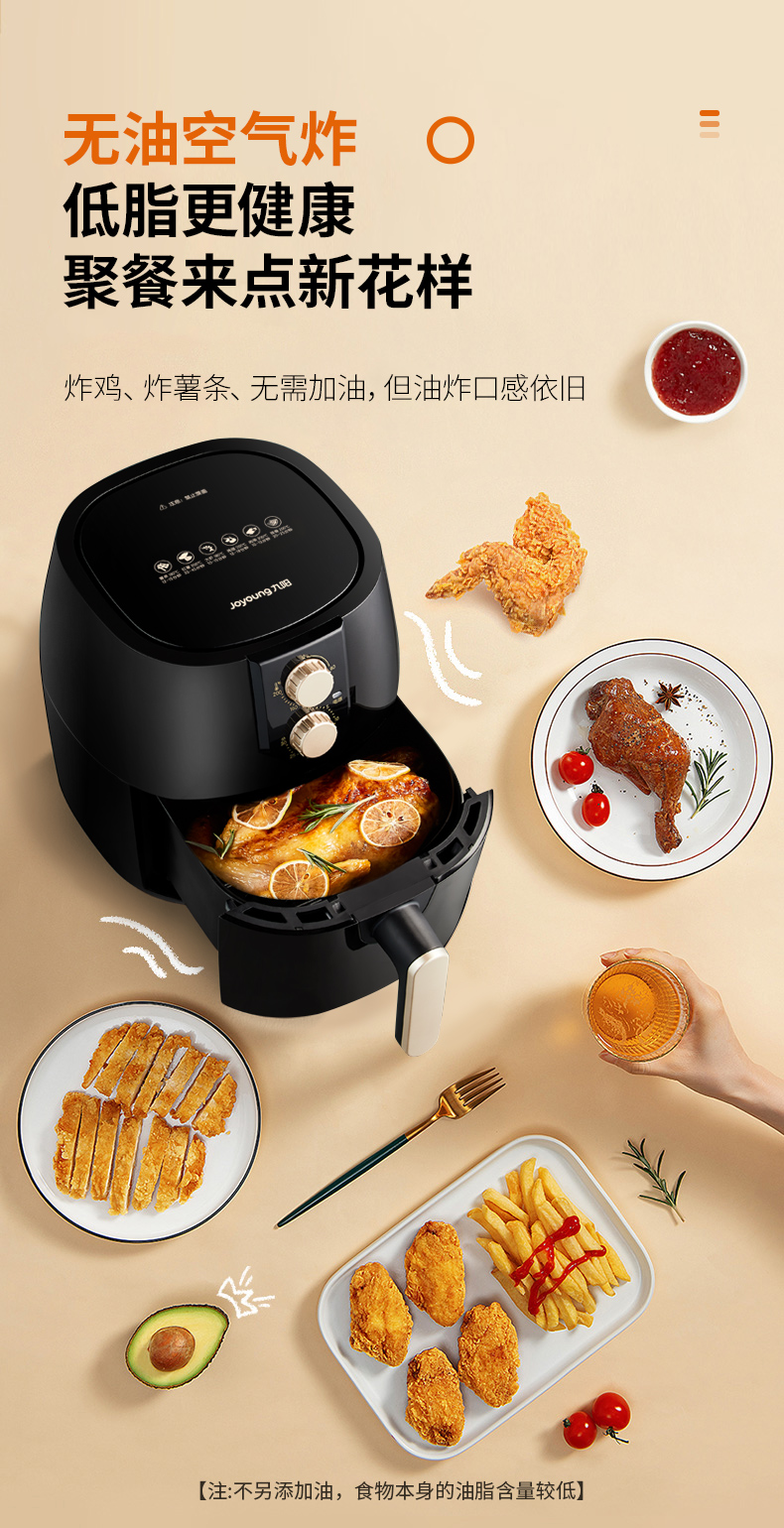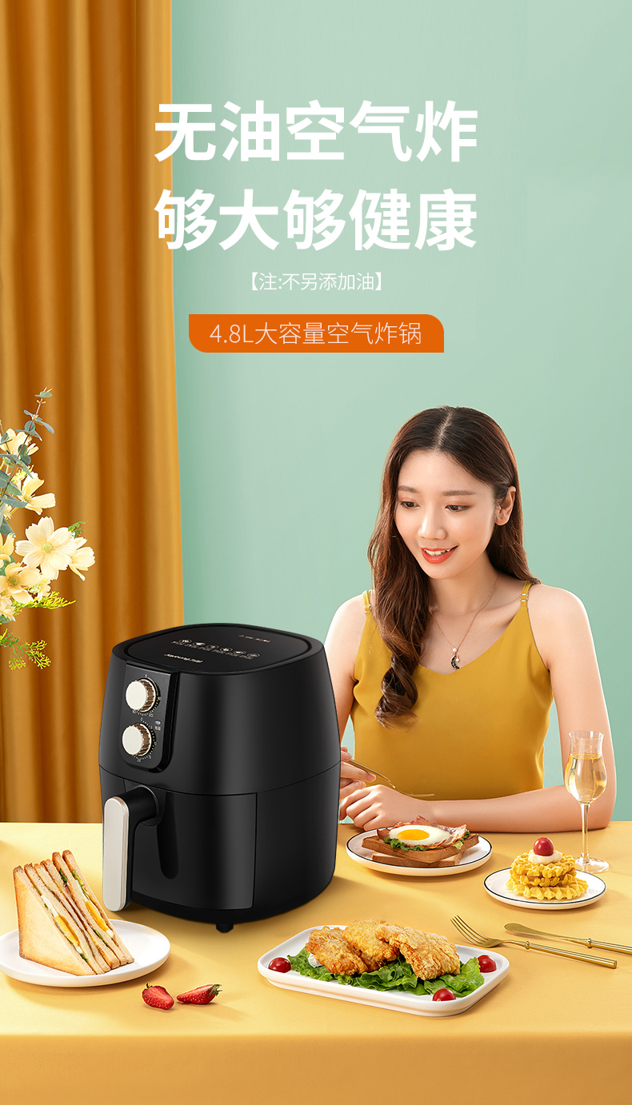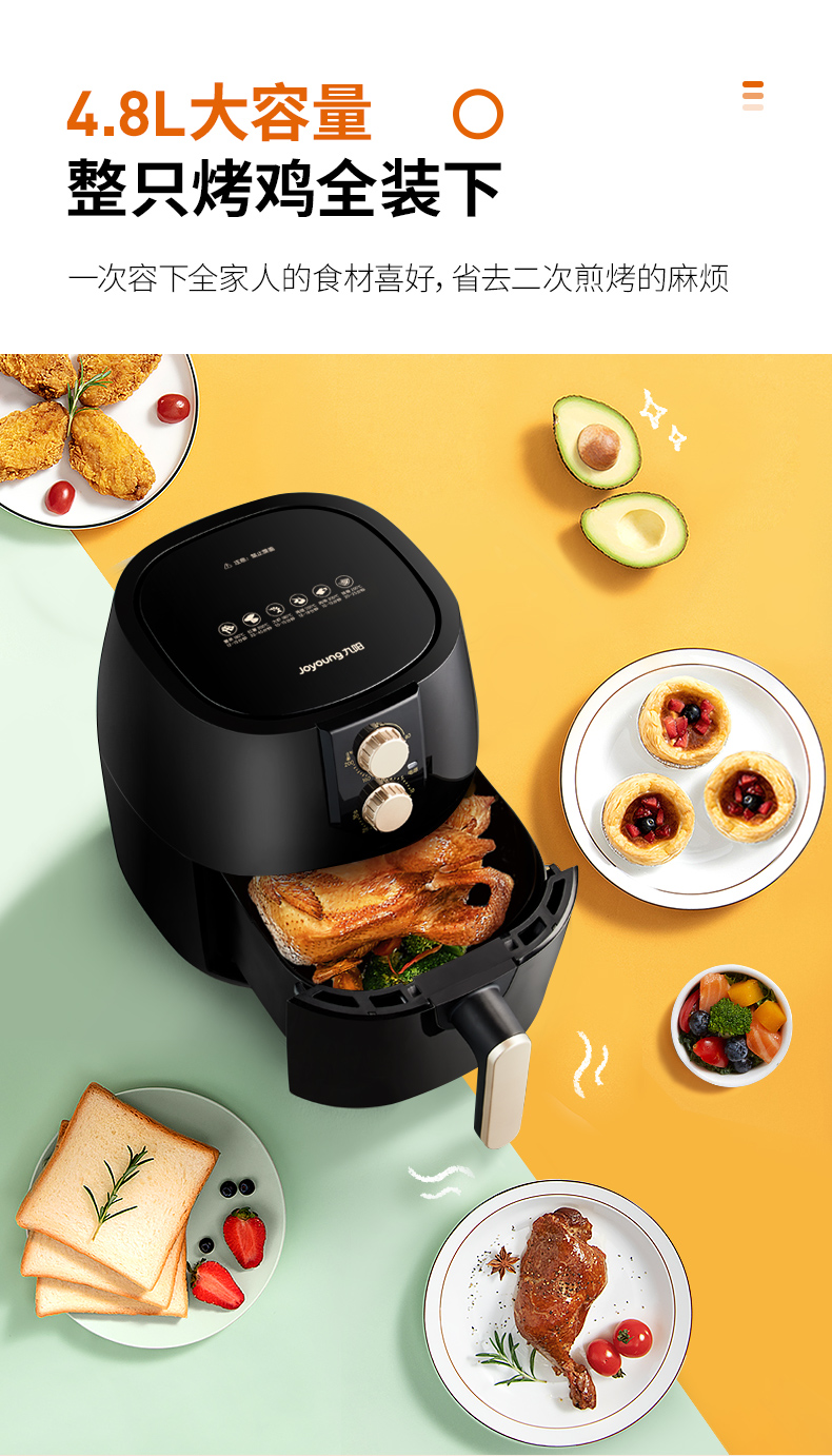 内腔是一体式设计,有不粘油涂层,炸篮和炸锅运用分离技术,按下释放按钮,轻松分离炸蓝和锅底,不粘油更易清洗;锅内容量是4.8L,能满足6-8人可用,一般的空气炸锅只有2L。