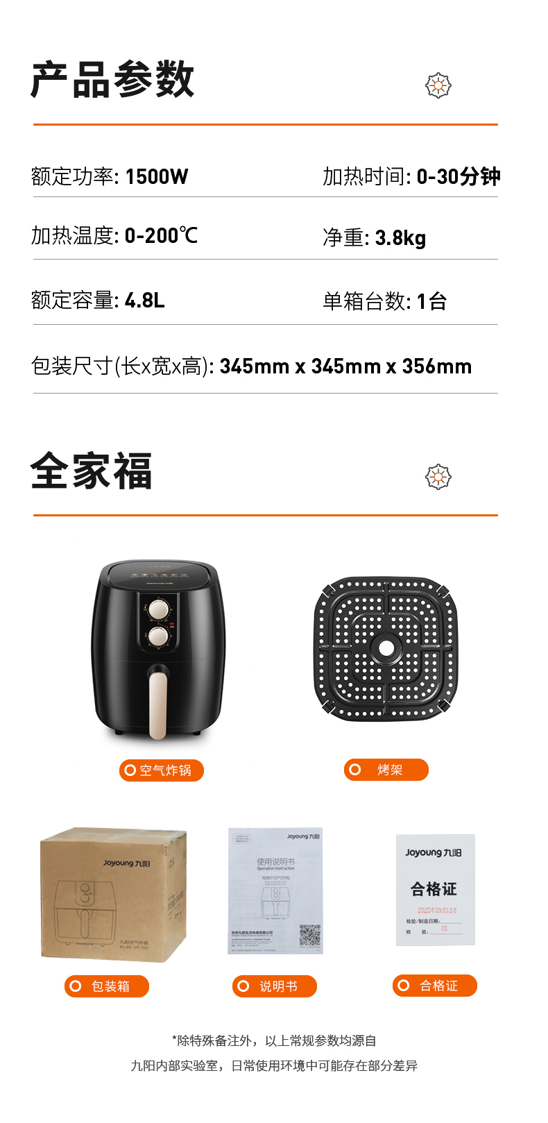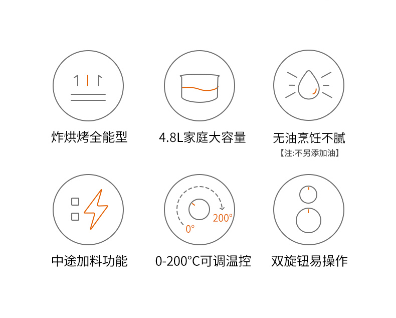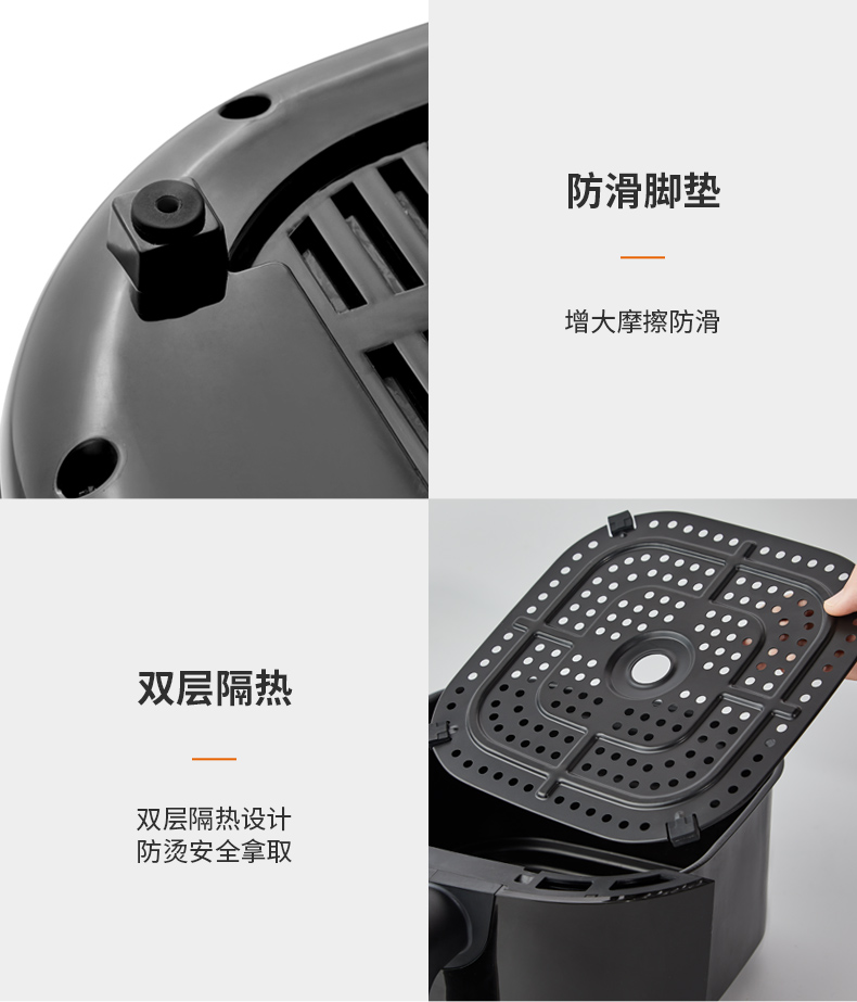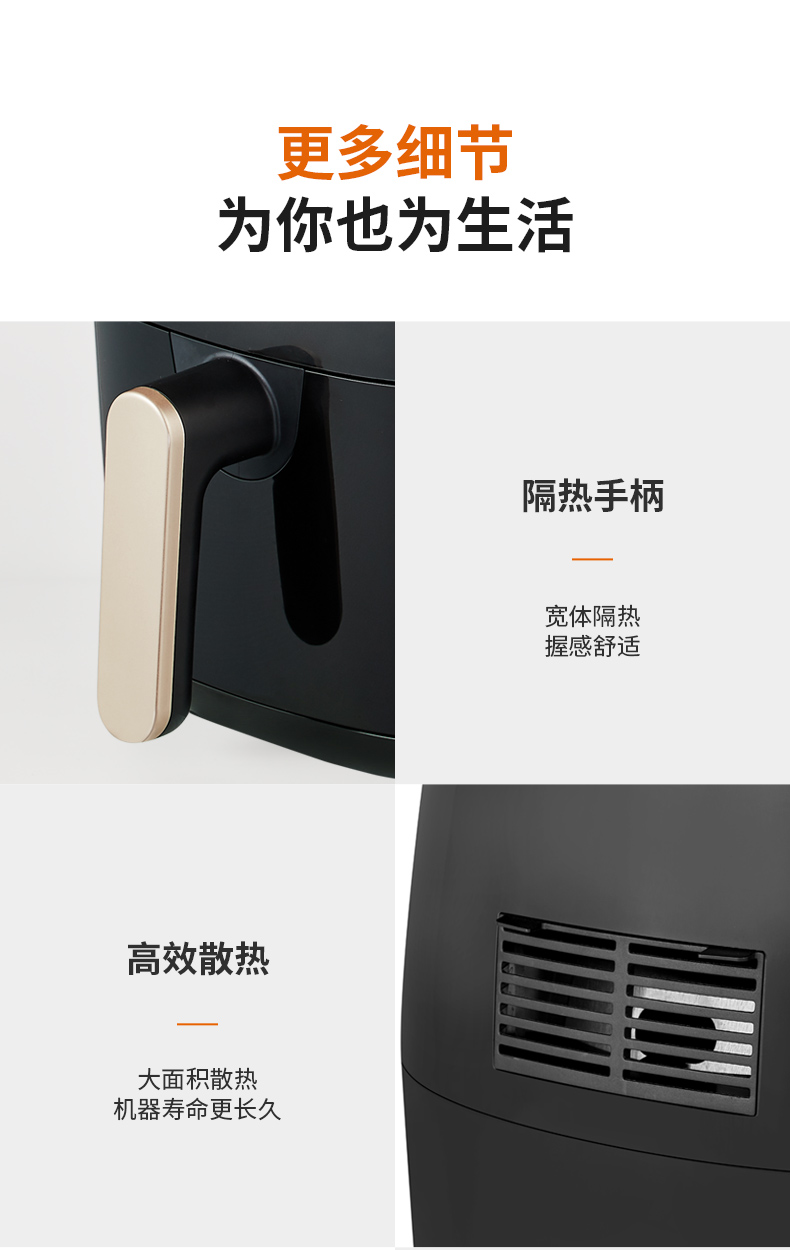 内腔是一体式设计,有不粘油涂层,炸篮和炸锅运用分离技术,按下释放按钮,轻松分离炸蓝和锅底,不粘油更易清洗;锅内容量是4.8L,能满足6-8人可用,一般的空气炸锅只有2L。