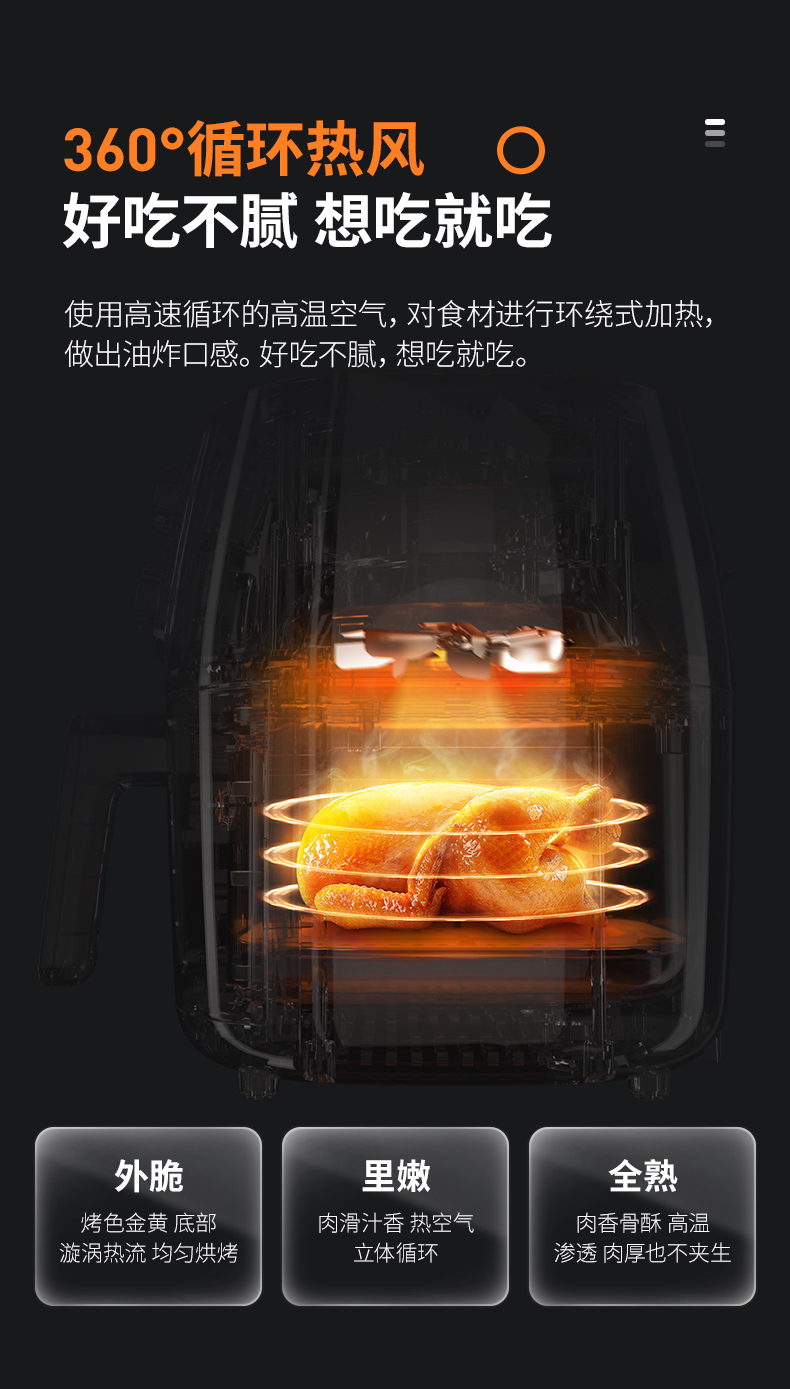 空气炸锅主要是通过空气循环加热锅内空气快速加热和脆化食物,360°无死角热风高转加热使食物受热均匀,外酥里嫩,同时锁住营养和水份,过滤多余油脂。